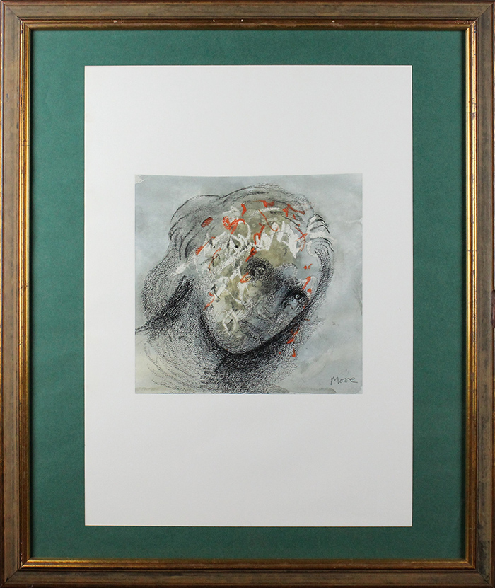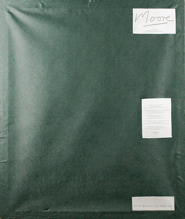 HENRY MOORE, "Head of Alice", 1981, Grafica in offset, Dim. 52x37, Al verso: etichetta con informazioni riguardanti l'opera (collana di opere d'arte edita dalla Seat diretta e curata da Carmine Benincasa) Opera riprodotta in 3000 esemplari è stata realizzata dalla Ilte a cura di Carmine Benincasa e la riproduzione delle tavole è stata realizzata direttamente sugli originali, esemplare N° 457/3000, Al fronte: firmata in basso a destra, Opera con cornice