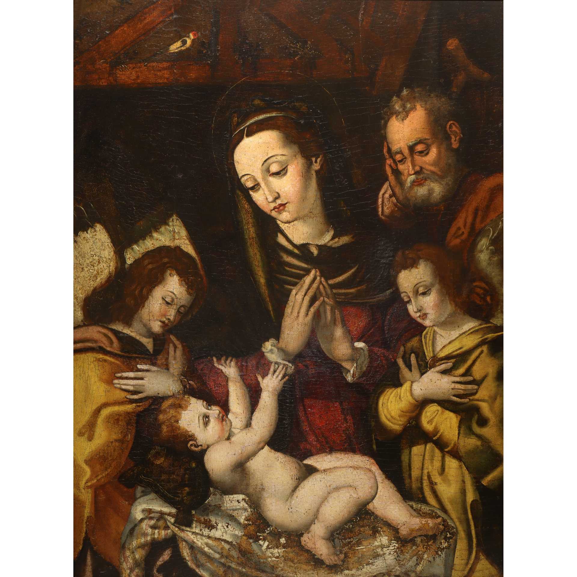 Il dipinto in oggetto raffigurante la Sacra Famiglia e i due angeli riflette una iconografia molto diffusa nel secolo XVI sia nelle diverse scuole pittoriche italiane che straniere.