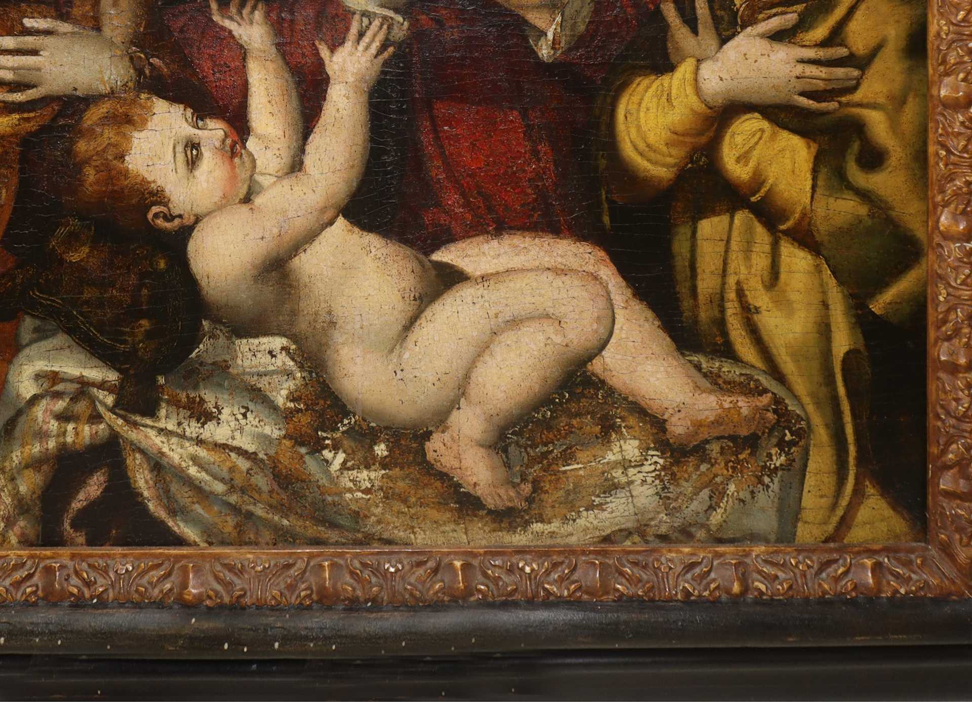 Madonna con Bambino, Angeli e San Giuseppe, 16° Secolo cm 104X78 in cornice 124X99 Olio su tavola