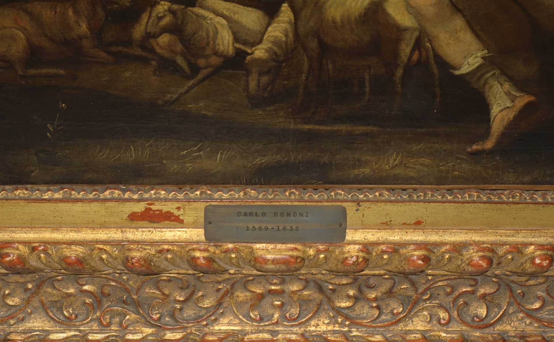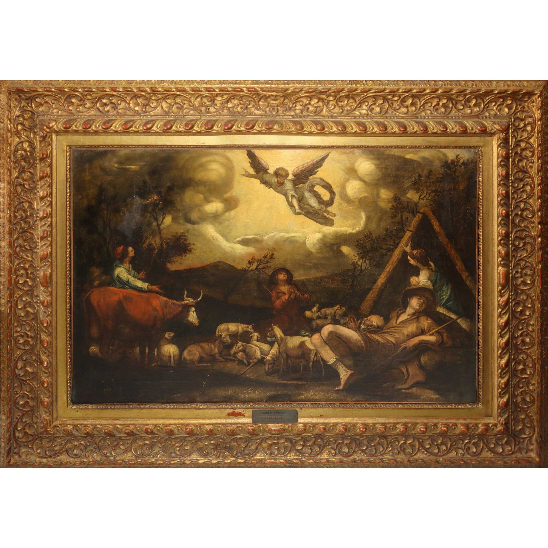 Angelo che annuncia ai pastori la nascita di Gesù, Emilian School 17° Secolo cm 25,5X97 in cornice cm 103X133 olio su tela