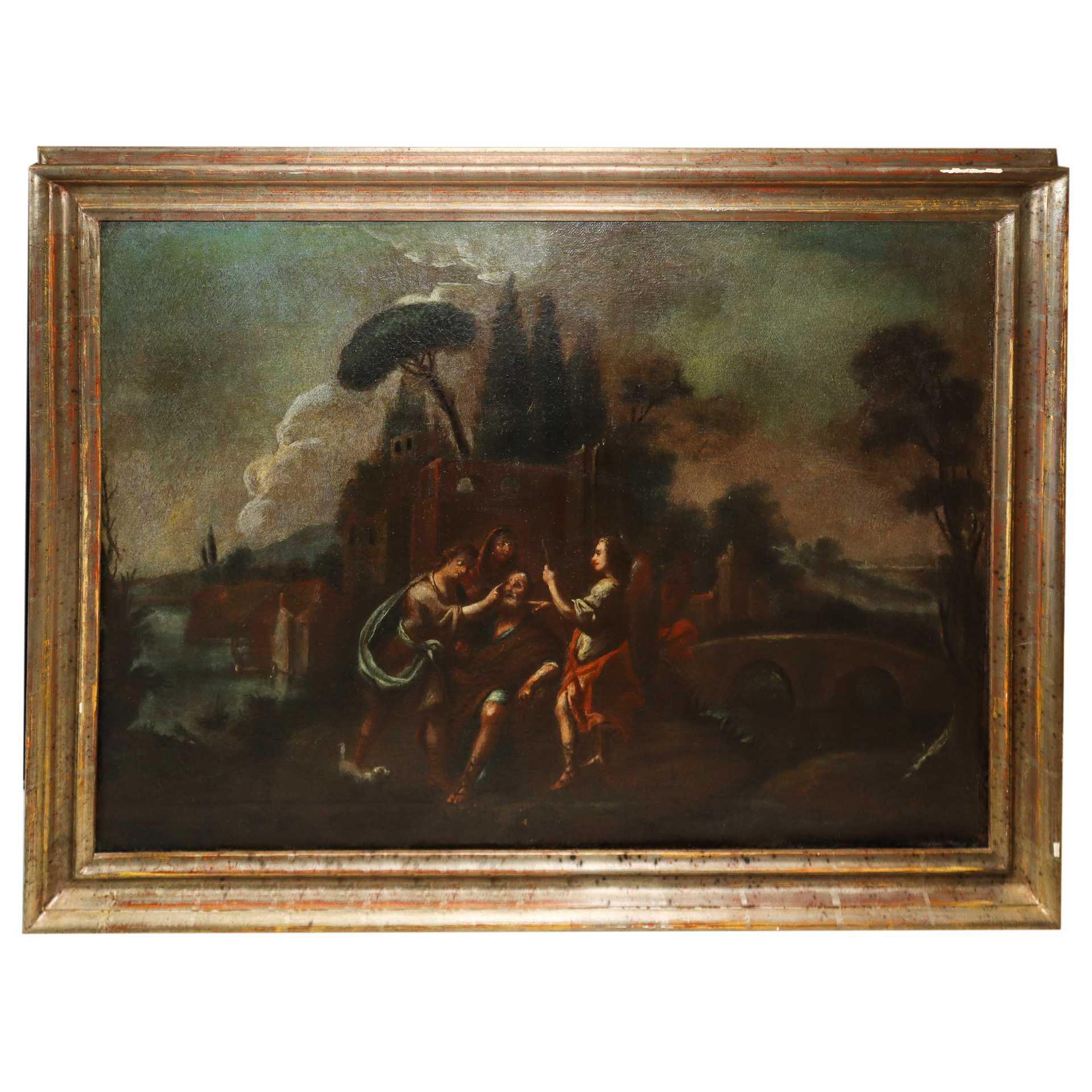 Scena biblica: Tobia che guarisce il padre con l'aiuto dell'Arcangelo Raffaele, 17th/18° Secolo cm 64X88 in cornice 77X100