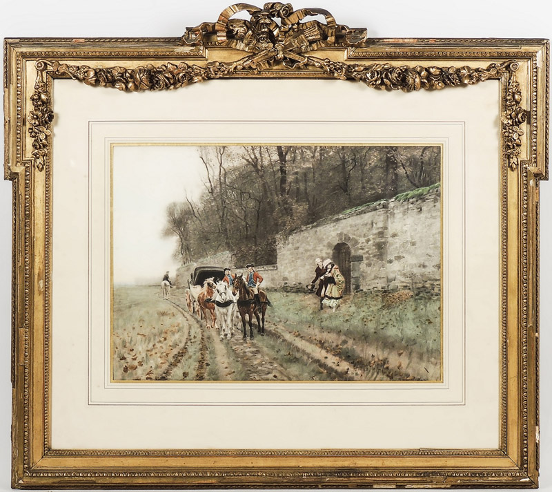 CHARLES EDOUARD DELORT (1841-1895) Paesaggio campestre con figura e carrozza - Country Landscape with Coach and Figures litografia - lithograpg, in cornice inlegno e pastiglia dorata intagliata con ghirlande di fiori e fiocco cm 41x57