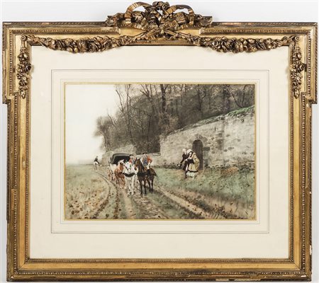 CHARLES EDOUARD DELORT (1841-1895) Paesaggio campestre con figura e carrozza...
