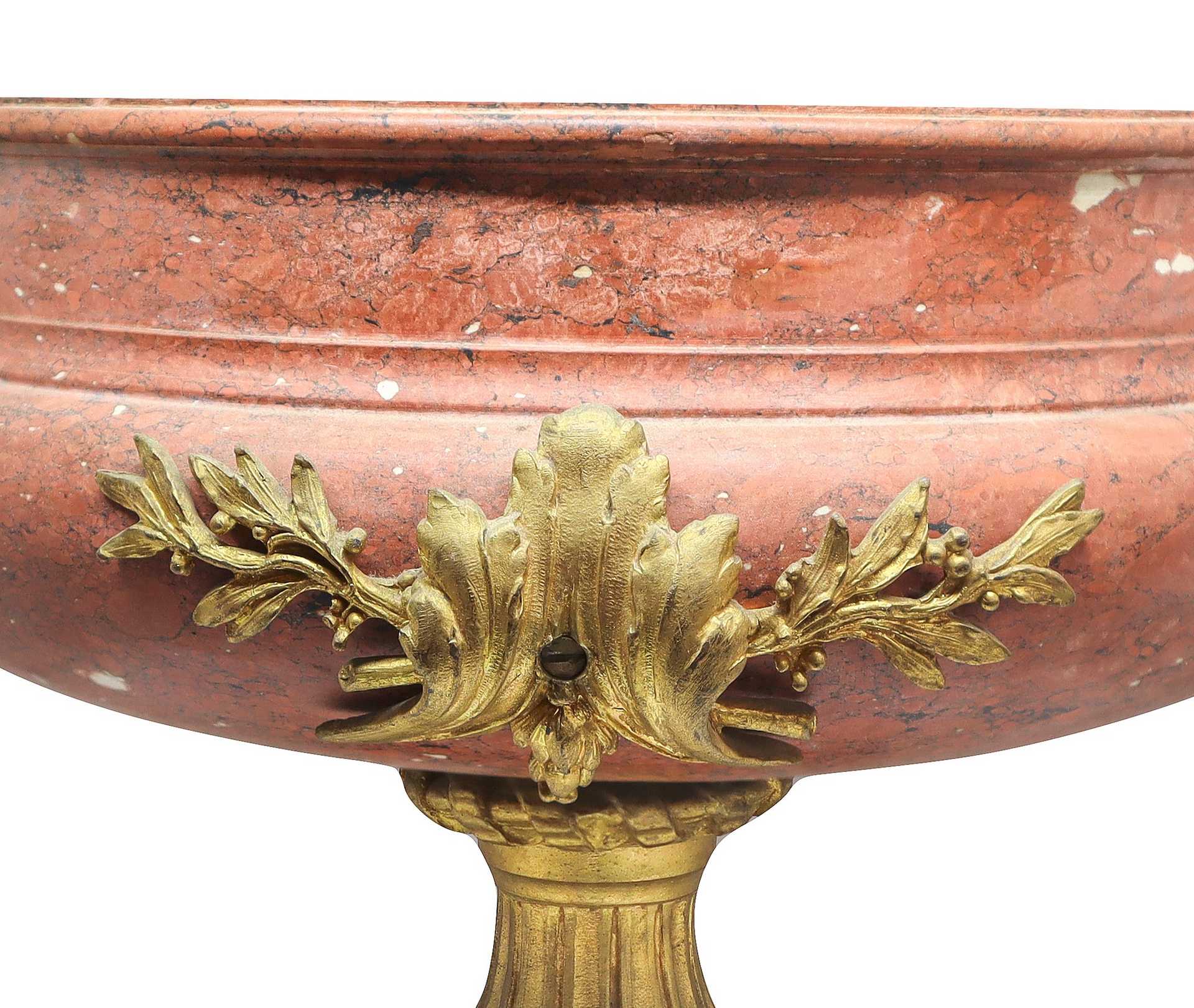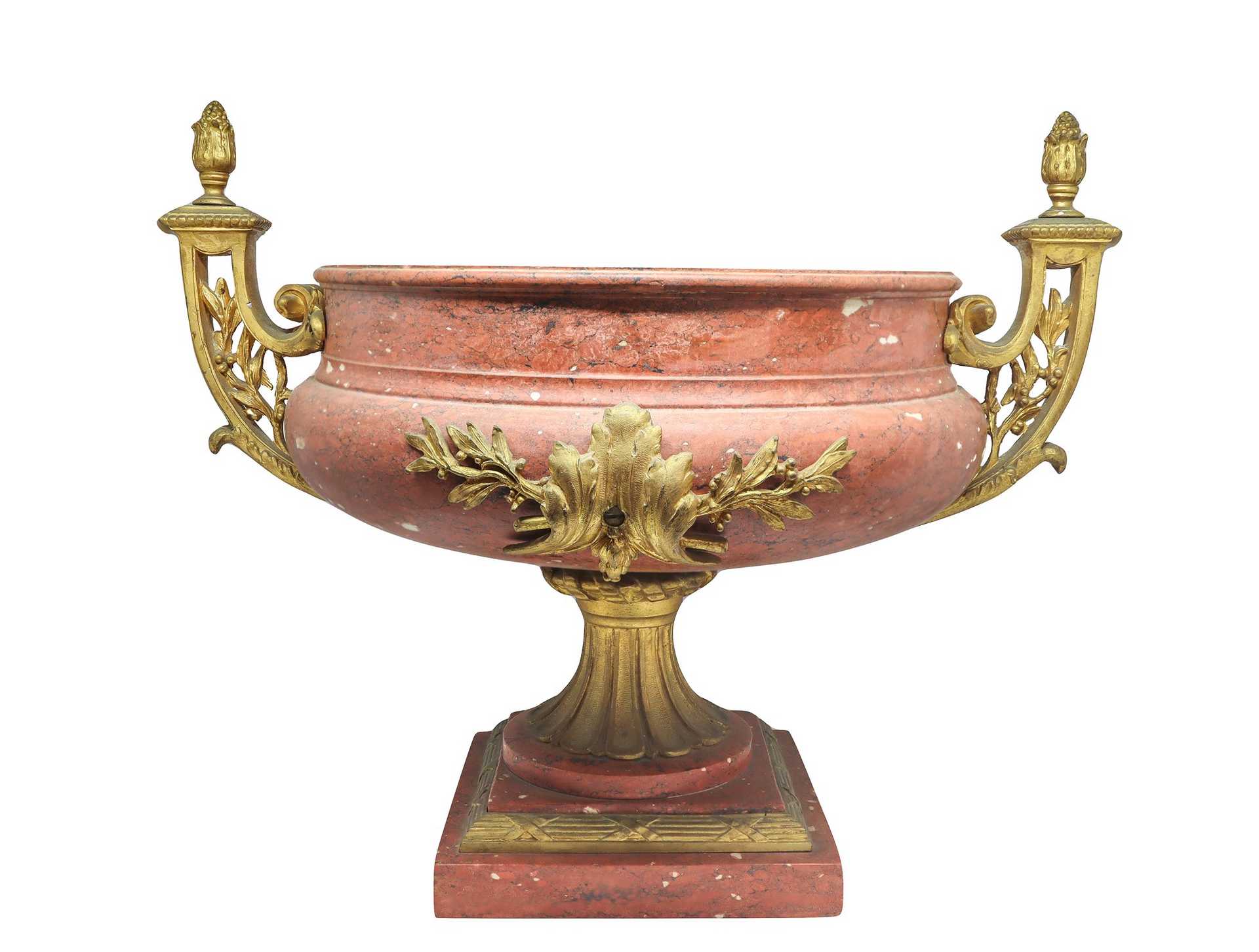 Splendido vaso in marmo rosso con alzata in forma neoclassica , XIX Secolo, Napoleon III H cm 32 x L cm 39 x P cm 33, diametro bocca cm 26 Manici e particolari in bronzo dorato. Manici e particolari in bronzo dorato.