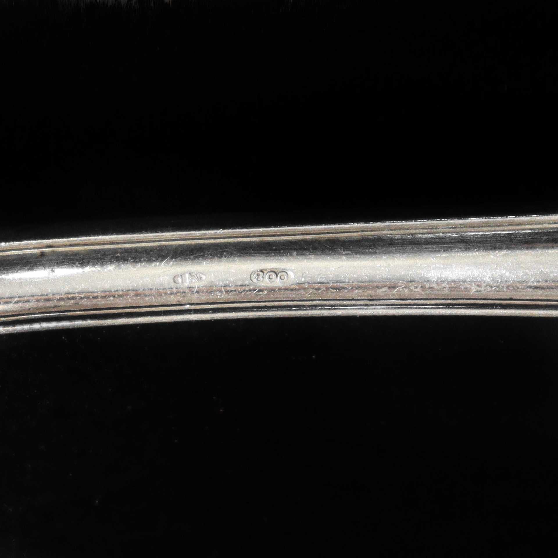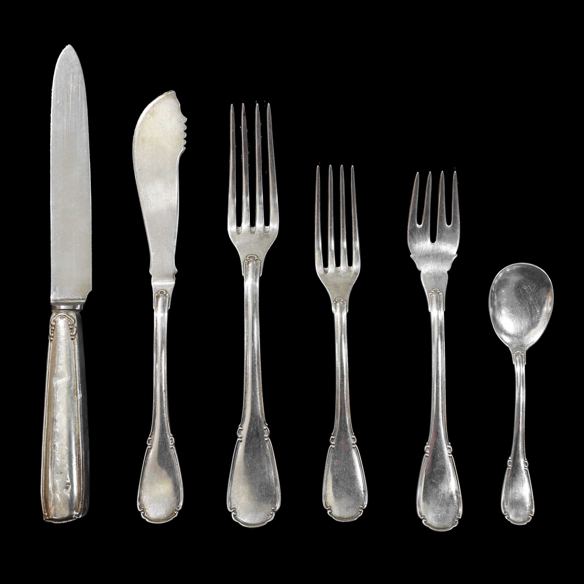 20 Coltelli grandi, 10 coltelli piccoli, 24 forchette grandi (gr. 1558), 12 forchette piccole (gr. 530), 12 cucchiai grandi (gr. 832), 9 cucchiaini da gelato (gr. 216), 12 coltelli pesce (gr. 652), 12 forchette pesce (gr. 618).