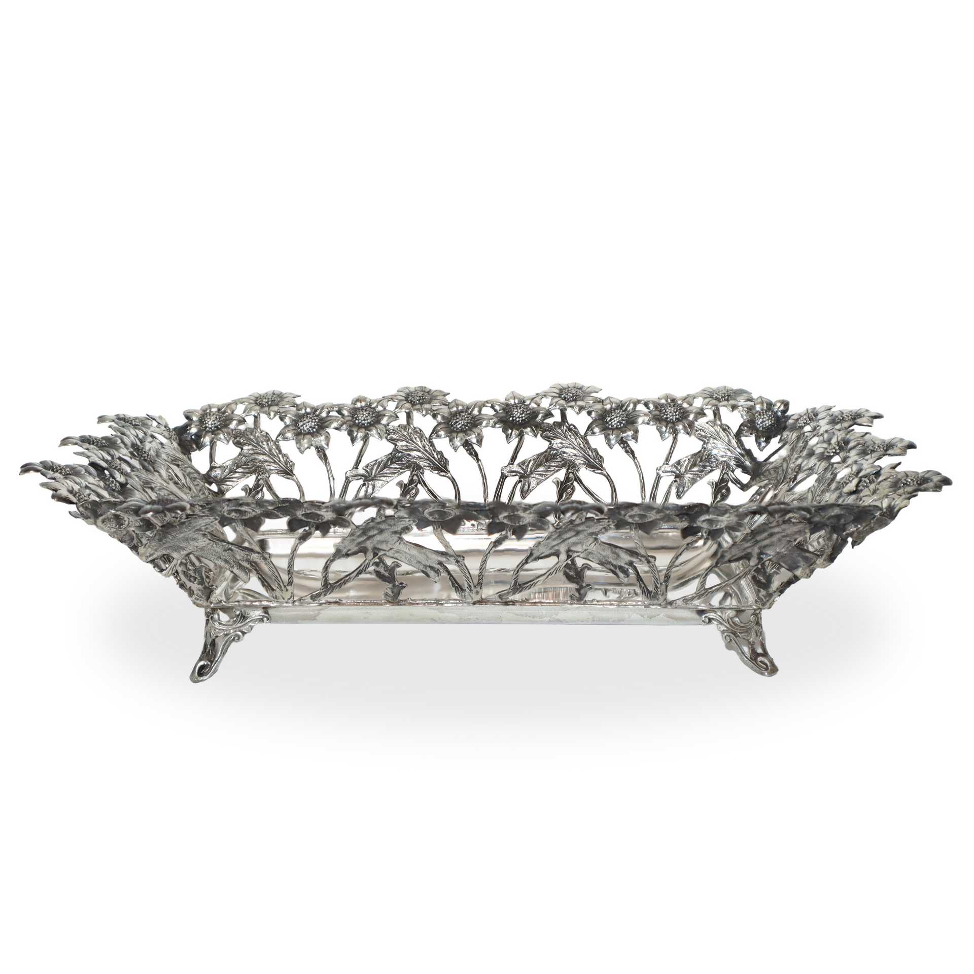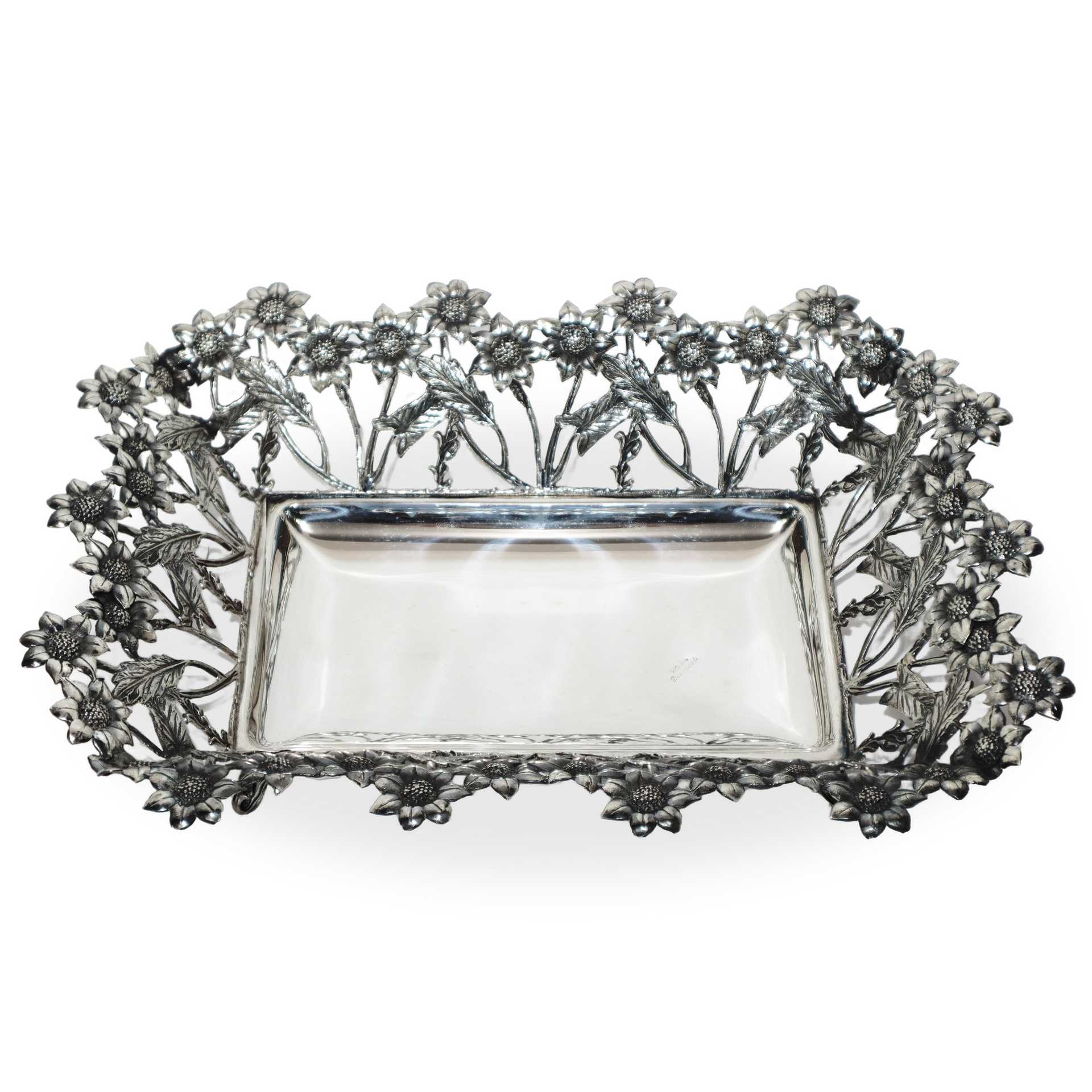 Osvaldo Benvenuti - Porta dolci in argento 925 di forma rettangolare Osvaldo Benvenuti H 7x27x20, gr 358 Decorazione dei bordi con fiori di girasole. Marchio della manifattura all'interno. In scatola originale Decorazione dei bordi con fiori di girasole. Marchio della manifattura all'interno. In scatola originale