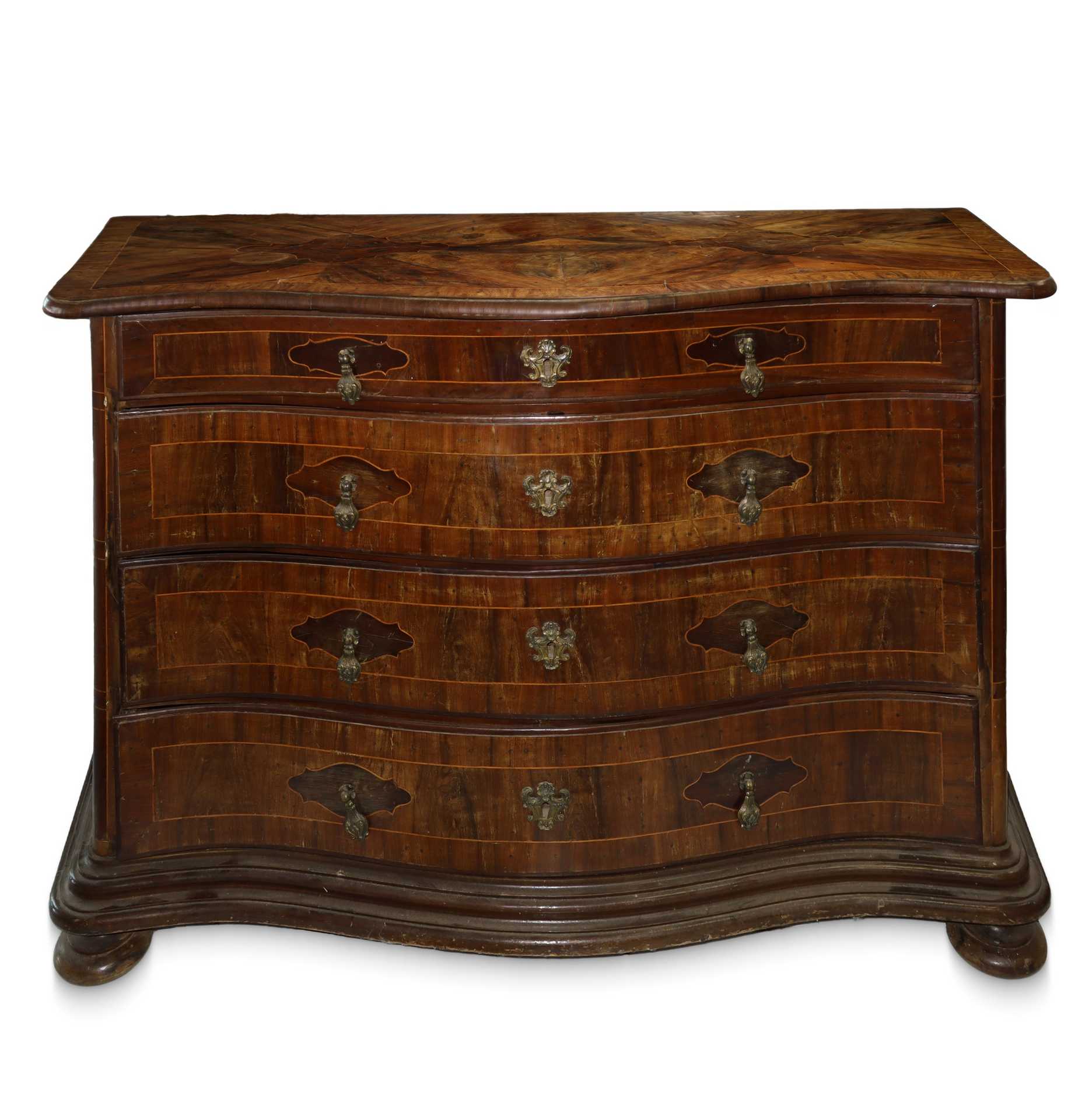 Lotto 164 | Cassettone Lugi XV maltese quattro cassetti piano in radica di ulivo e noce