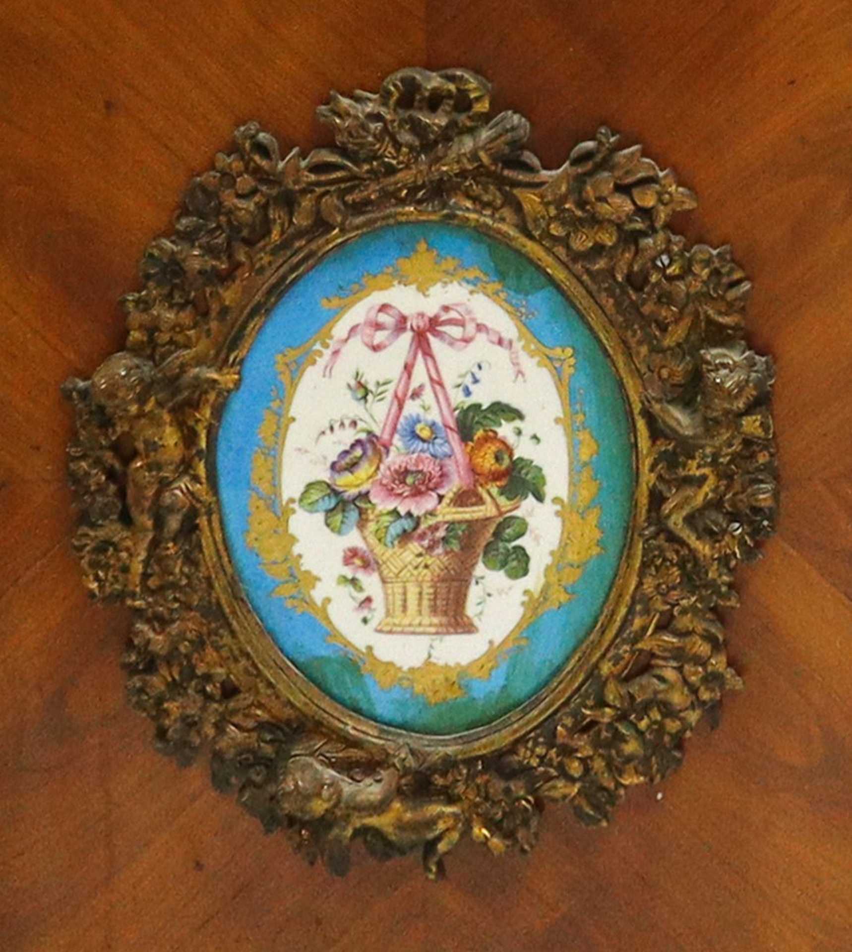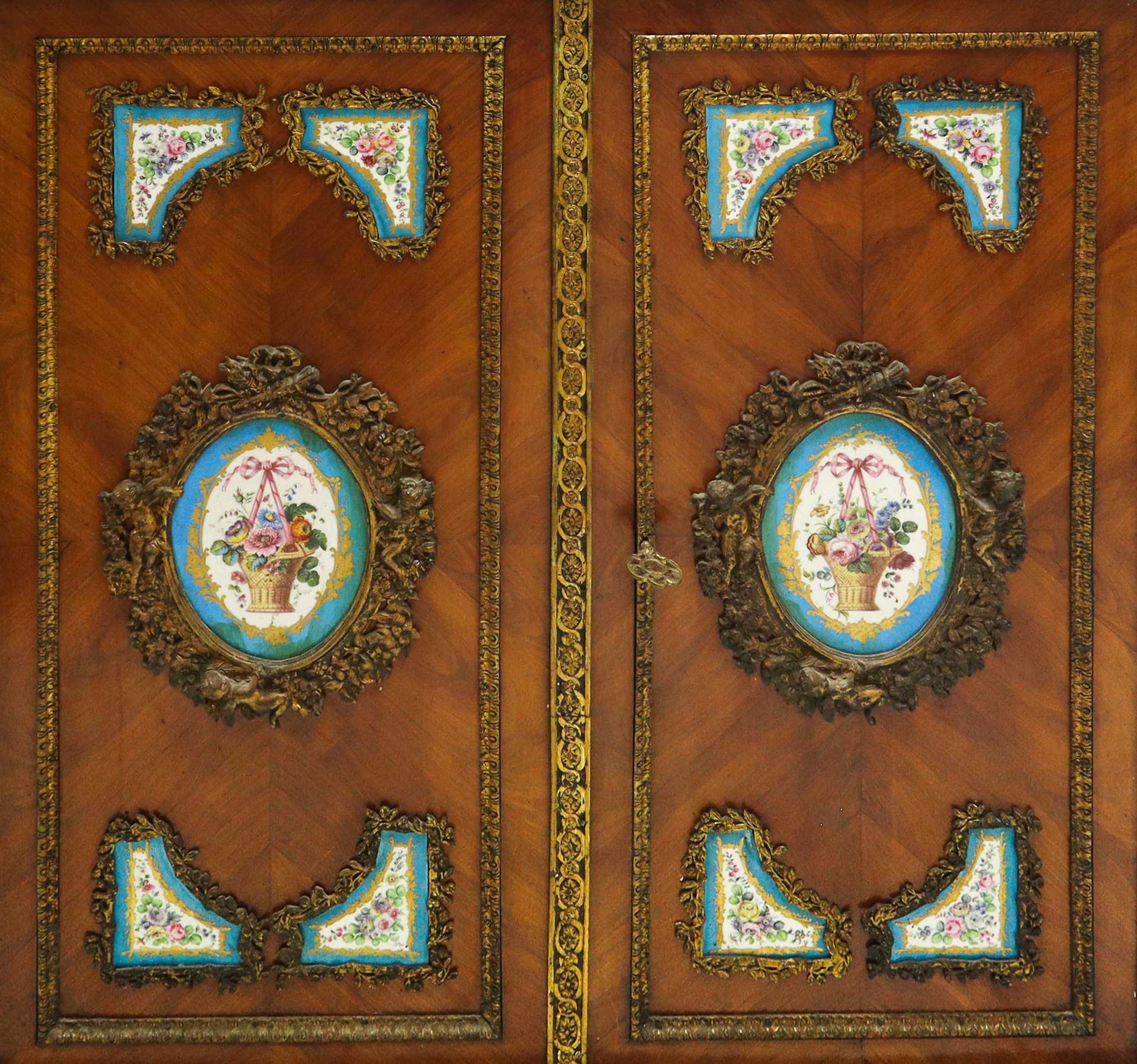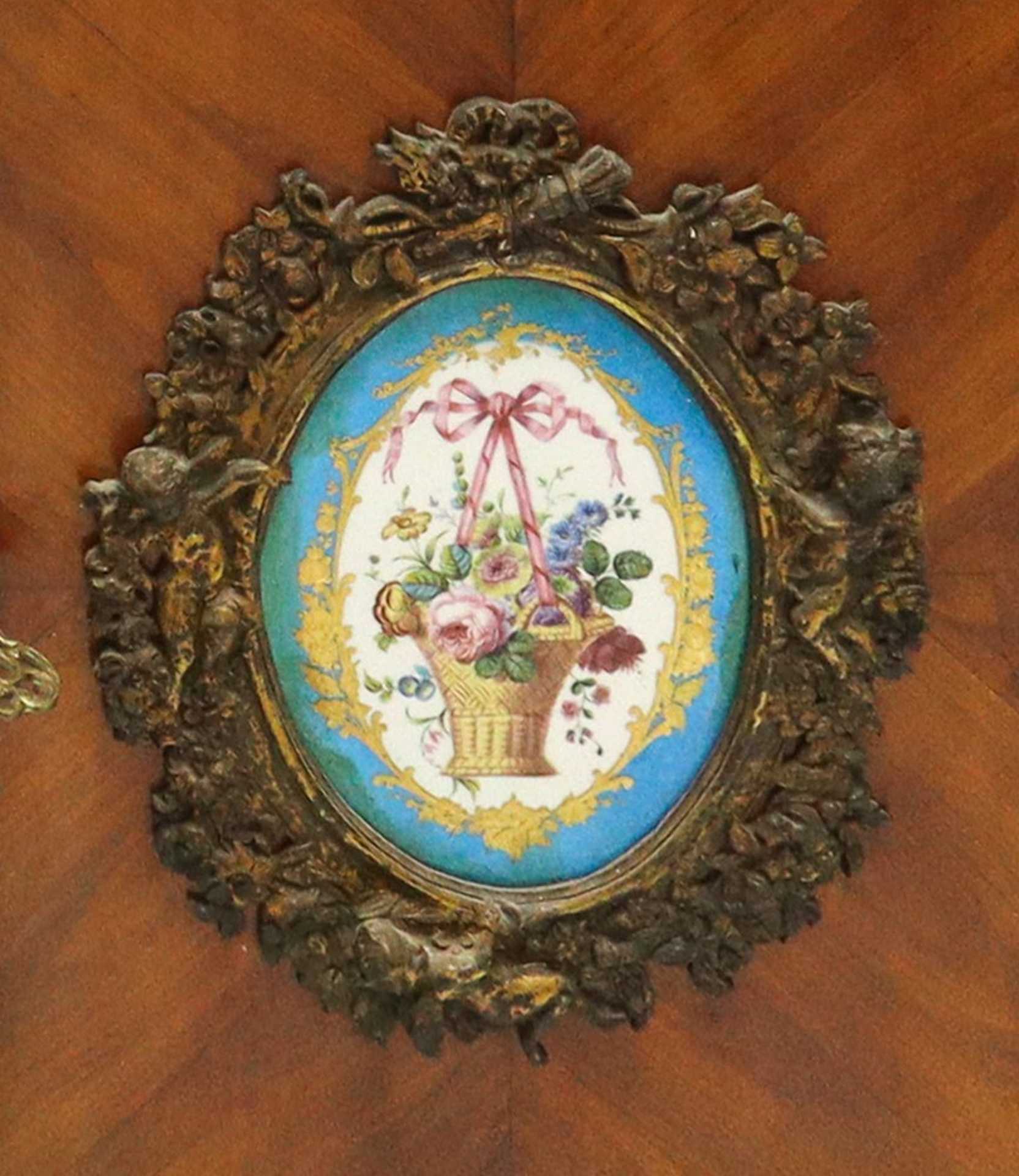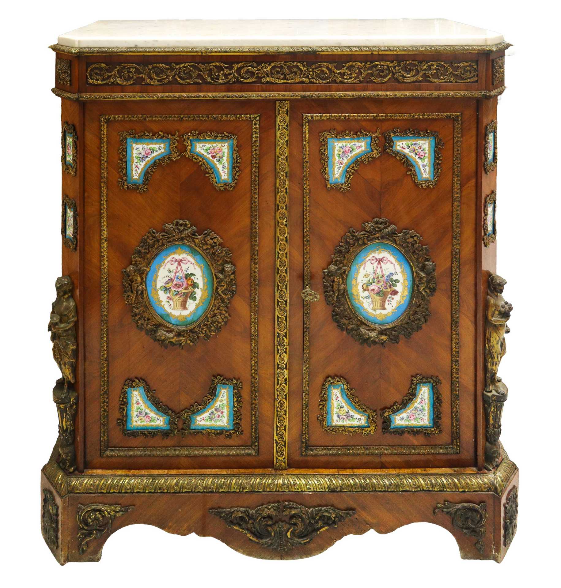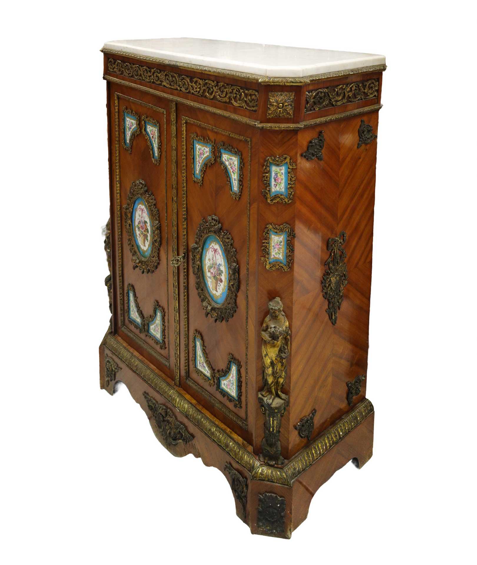Credenza Napoleone III in legno di rosa e marmo bianco al piano cm 122,5X108,5X43 Con applicazioni di porcellane di Sevres dipinte a motivi floreali cornici in metallo dorato applicate al sottopiano e agli sportelli figure femminili in metallo dorato ai bordi e placche dorate ai lati e alla base.Con applicazioni di porcellane di Sevres dipinte a motivi floreali cornici in metallo dorato applicate al sottopiano e agli sportelli figure femminili in metallo dorato ai bordi e placche dorate ai lati e alla base.