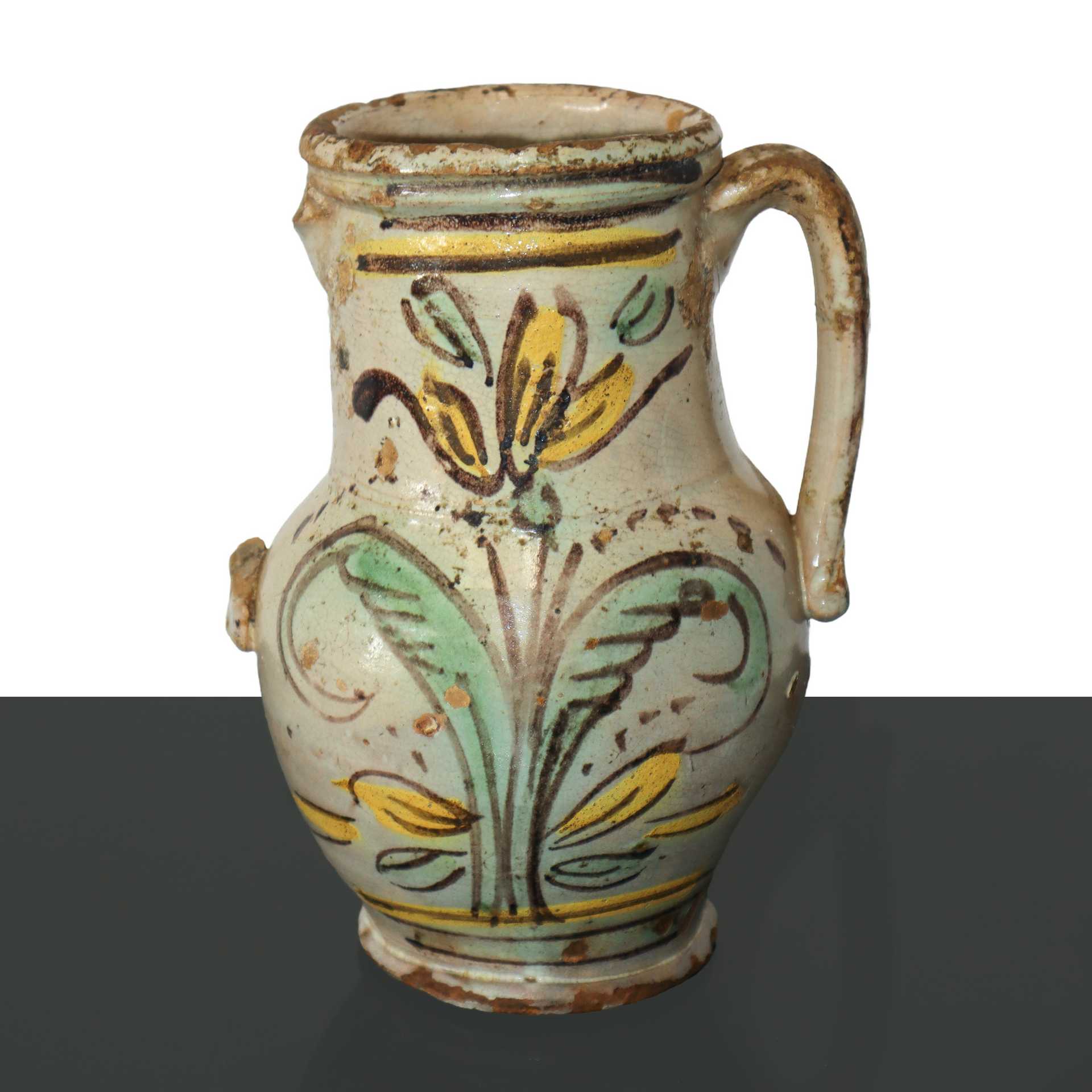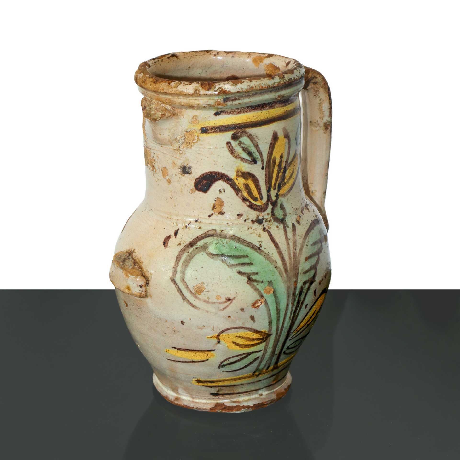 Piccola quartara in maiolica policroma ceramica di Caltagirone cm 23X14 Mancanza di un manico, sbeccatura alla base. Datazione 1838 sul retro.Mancanza di un manico, sbeccatura alla base. Datazione 1838 sul retro.