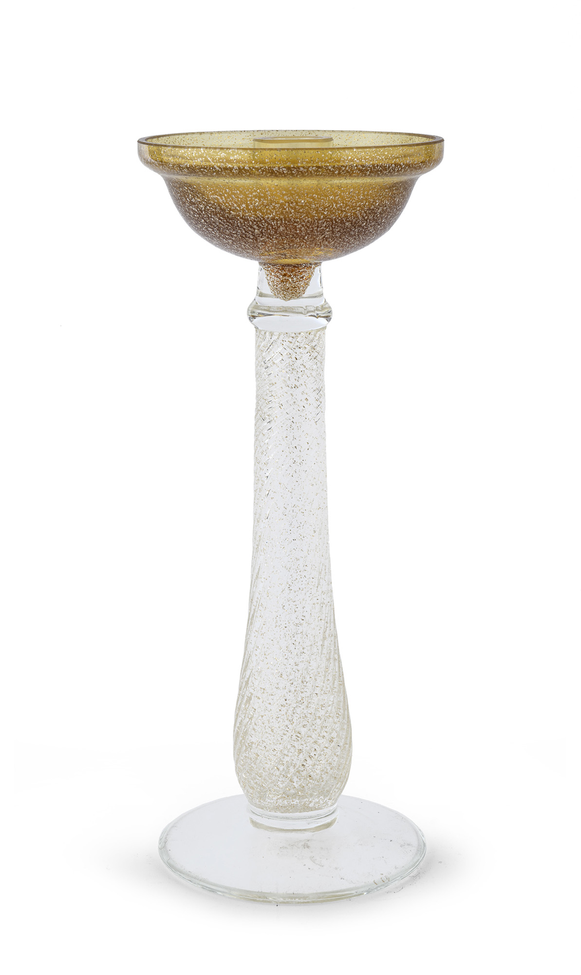 a fondo trasparente con corpo a torceon e portacandele a fondo arancio con inclusioni in avventurina.