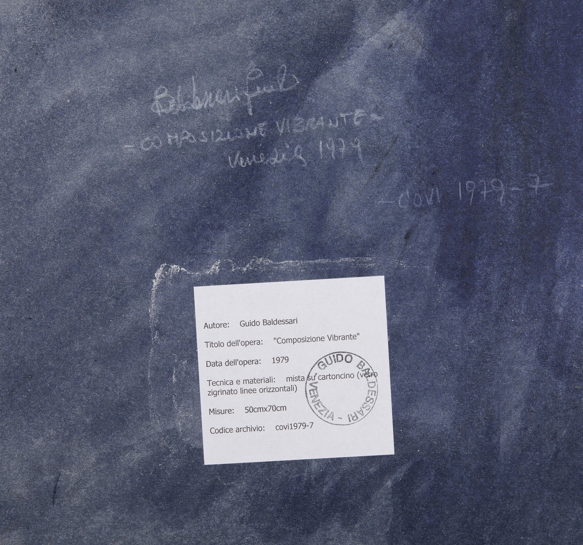 BALDESSARI GUIDO (n. 1938) COMPOSIZIONE VIBRANTE, 1979. tecnica mista su cartoncino. Cm 50,00 x 70,00. sul retro: firma, data e titolo; etichetta e timbro Guido Baldessari, Venezia