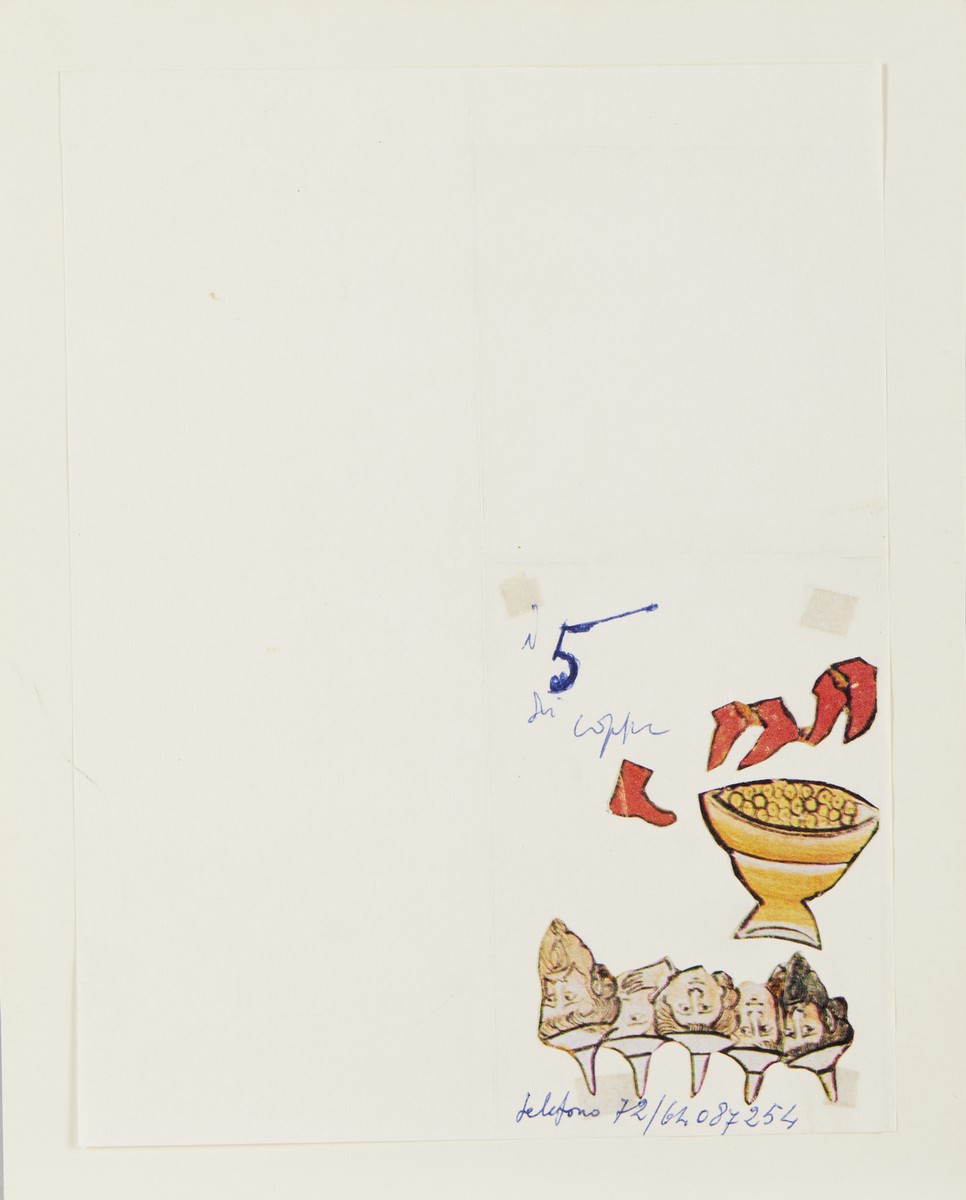 VILLA EMILIO (1914 - 2003) I CINQUE DI COPPE. tecnica mista e collage su carta applicata su cartoncino. Cm 18,00 x 22,50. l'opera è stata eseguita nello spazio in basso a destra di un foglio, 20 x 15 cm, precedentemente ripiegato in quattro parti e applicato su di un cartoncino tramite scotch;