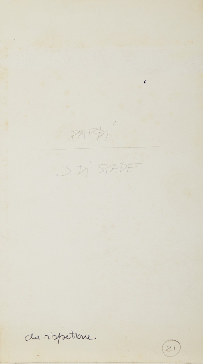 PARDI GIANFRANCO (n. 1933) TRE DI SPADE. collage e tecnica mista su cartoncino. Cm 15,50 x 27,00. sul retro: firma, titolo e iscrizione