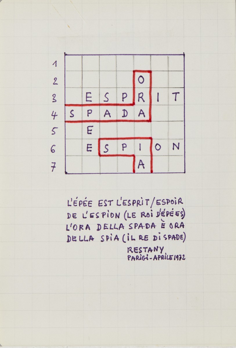 RESTANY PIERRE (1930 - 2003) IL RE DI SPADE, 1972. tecnica mista su carta a quadri di 1 cm. Cm 14,00 x 21,00. firma, data e titolo