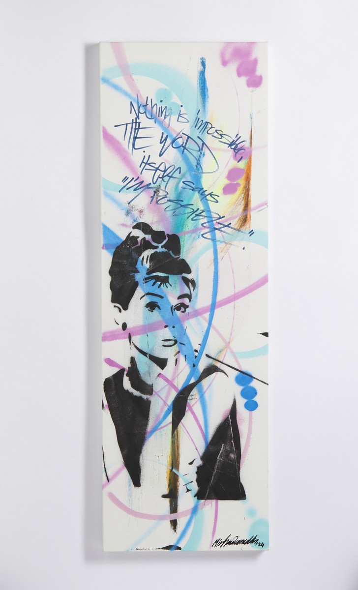 MIRGHAWAMEDDIN PARSCHA (n. 1979) HEPBURN N.134, 2024. acrilico e spray su tela. Cm 39,00 x 119,00. firma e data