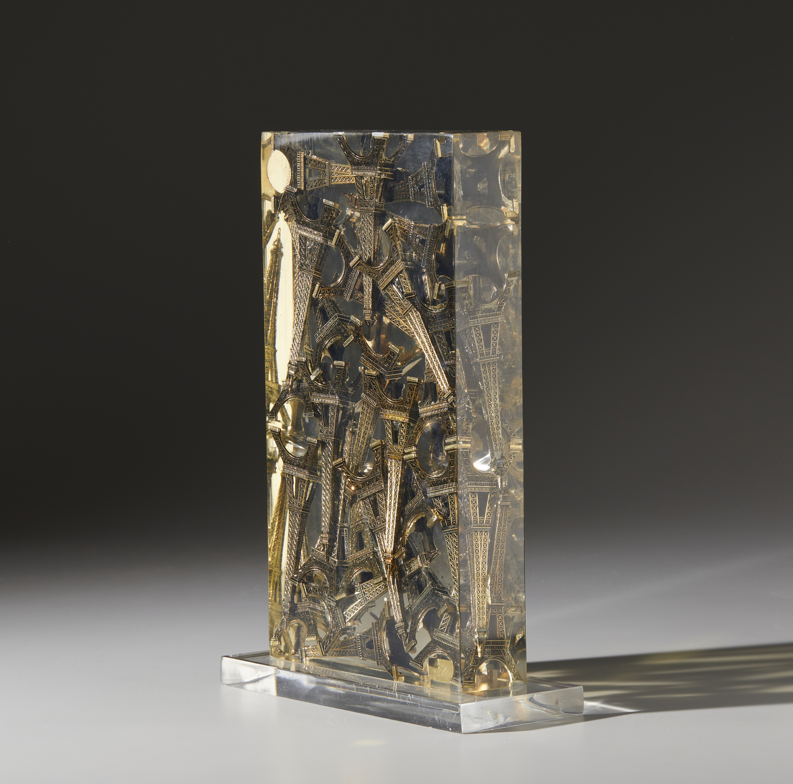 ARMAN FERNANDEZ (1928 - 2005) HOMMAGE A EIFFEL, 1994. Inclusione in resina. Cm 20,00 x 34,50 x 10,00. firma e tiratura alla base, es. 44/100.