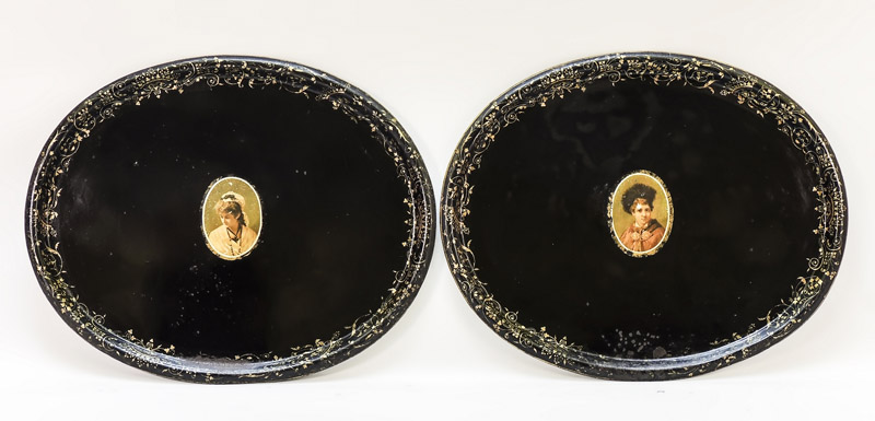 Lotto 927 | COPPIA DI VASSOI OVALI IN TOLE - PAIR OF OVAL TOLE TRAYS al centro ritratti...