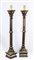 COPPIA DI TORCIERE IN RAME - PAIR OF COPPER PRICKETS fusto a colonna scanalata, sbalzato con pampini su base quadrata rivestita in metallo e sbalzata con mascheroni, montate a lume h cm 154,5