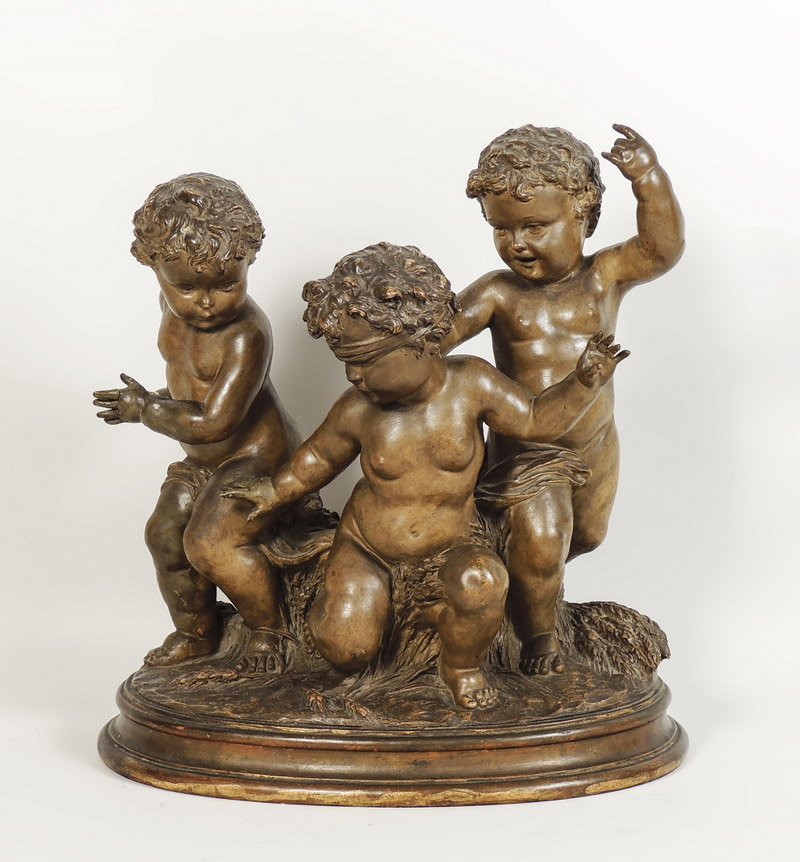 GRUPPO IN TERRACOTTA PATINATA - PATINATED TERRACOTTA FIGURAL GROUP raffigurante tre putti che giocano a mosca cieca, da un modello di Joseph D'Aste, firmato, difetti e mancanze h cm 45