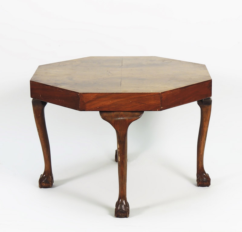 TAVOLINO BASSO IMPIALLACCIATO IN NOCE - WALNUT VENEERED TEA TABLE piano ottagonale, gambe mosse, piedi ad artiglio su palla schiacciata h cm 41,5, diam cm 65
