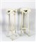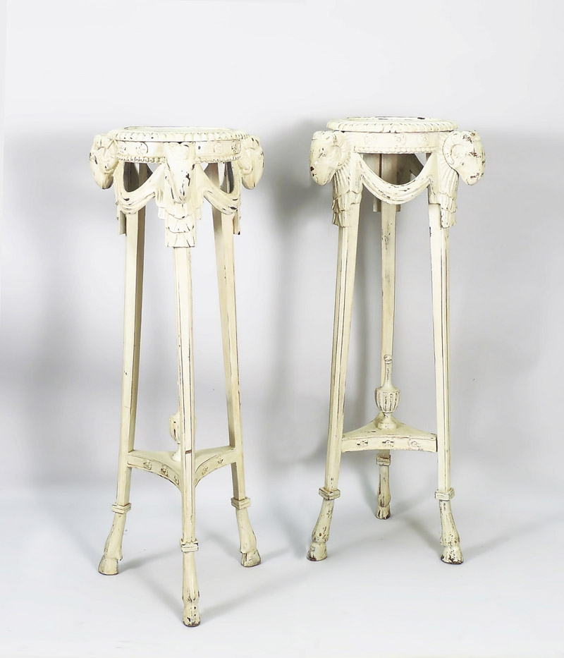 COPPIA DI GUERIDONS IN LEGNO LACCATO BIANCO - PAIR OF WHITE LACQUERED GUERIDONS ripiano circolare, tre alti sostegni con finali a testa di ariete e piedi a zampa ferina, riuniti da traversa sagomata e pinnacolo, lievi difetti h cm 110, diam cm 32