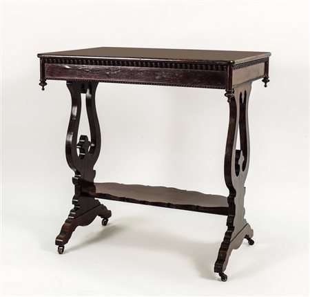 TAVOLINO DA APPOGGIO IN MOGANO E PALISSANDRO - MAHOGANY AND ROSEWOOD TABLE inizio del XX secolo - early 20th Century ripiano bordato da motivo a cordoncino con pinnacoli, gambe a lira riunite da traversa sagomata, con rotelle, piccola mancanza h cm 74,5x72x48,5