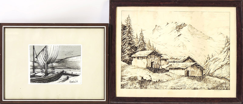 PAESAGGIO MONTANO E SCORCIO DI PORTO CON BARCA - MOUNTAIN LANDSCAPE AND PORT VIEW WITH A BOAT due disegni a china su carta - two indian ink drawings on paper, firmati, in cornice cm 27x38 e cm 13x16