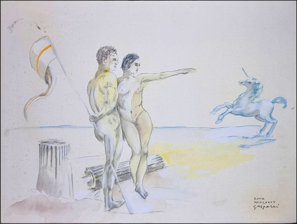 GASPARRI ALBERTO Roma 1956 "Parsifal" Matita e acquerello su cartoncino cm 76x57, del 1985. Firmata, situata e datata sul fronte in basso a destra. Sul retro tecnica, titolo e timbro descrittivo della Leonardo Arte.