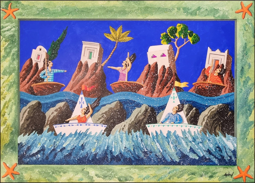 APHEL FABIO Cavalese (TN) 1957 "Per mare" Olio su tavola cm 70x50. Firmato sul fronte in basso a destra. Sul retro titolo, firma e dimensioni.