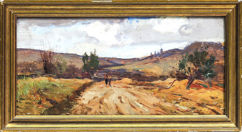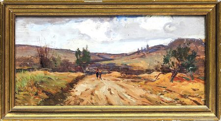 GIORGIO LUXARDO Paesaggio campestre con personaggi - Country Landscape with Figures olio su tavoletta - oil on panel, firmato, in cornice cm 14x29