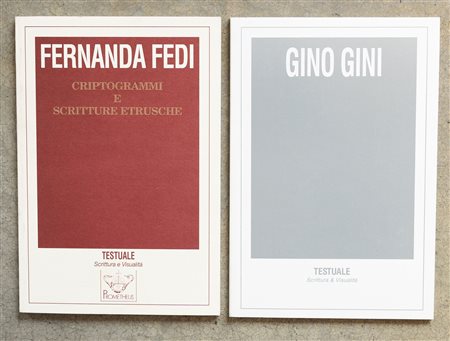 LOTTO MULTIPLOLotto di due cataloghiFernanda Fedi - Criptogrammi e scritture etrusche 1989 - 19961996Catalogo monografico illustrato realizzato su una tiratura di 700 esemplari20,5 x 14 cmPrometheus EditricePagine 88 Senza difetti Gino Gini - Il viaggio dietro le forme della fontana 1976 - 19921993Catalogo monografico illustrato realizzato su una tiratura di 900 esemplari, timbro d'artista sull'ultima pagina20,5 x 14 cmEdizione Myself printPagine 57Senza difetti
