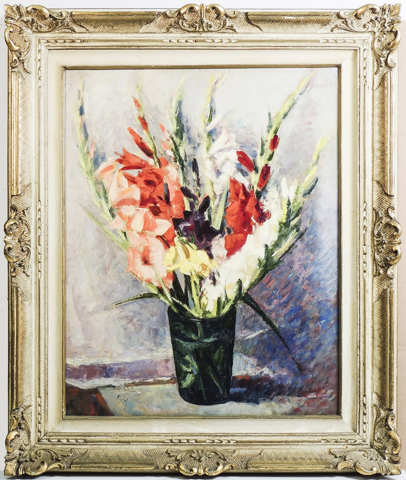 CORRADO MICHELOZZI (1883-1965) Gladioli - Flowers in a Vase olio su tavoletta - oil on panel, siglato, al verso firmato e titolato, in cornice cm 70x55