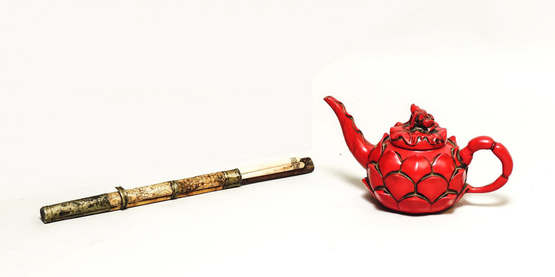 LOTTO DI OGGETTI ORIENTALI - ORIENTAL LOT una piccola teiera in lacca rossa modellata come un fiore di loto ed un set di posate da viaggio in bambù con bacchette in avorio