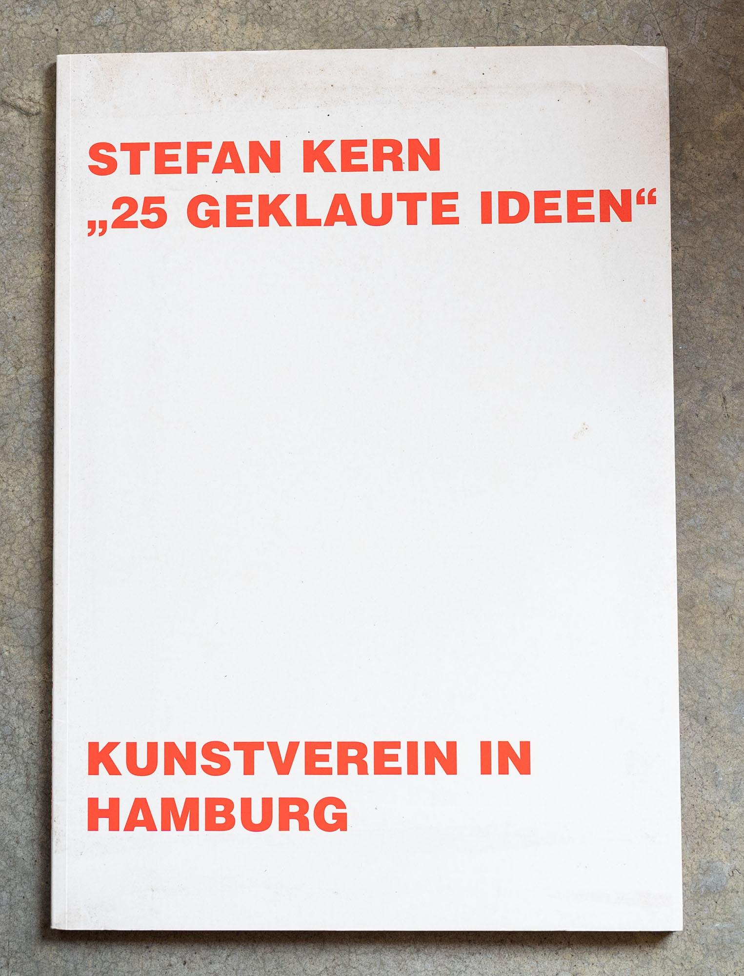 STEFAN KERN(1966)Stefan Kern '25 Geklaute Ideen'2002Catalogo monografico illustrato edito in occasione della mostra tenutasi presso la Kunstverein in Hamburg, Amburgo (23 febbraio - 7 aprile 2002)34 x 24 cmEdizione del museoSenza numero di pagineDifetti