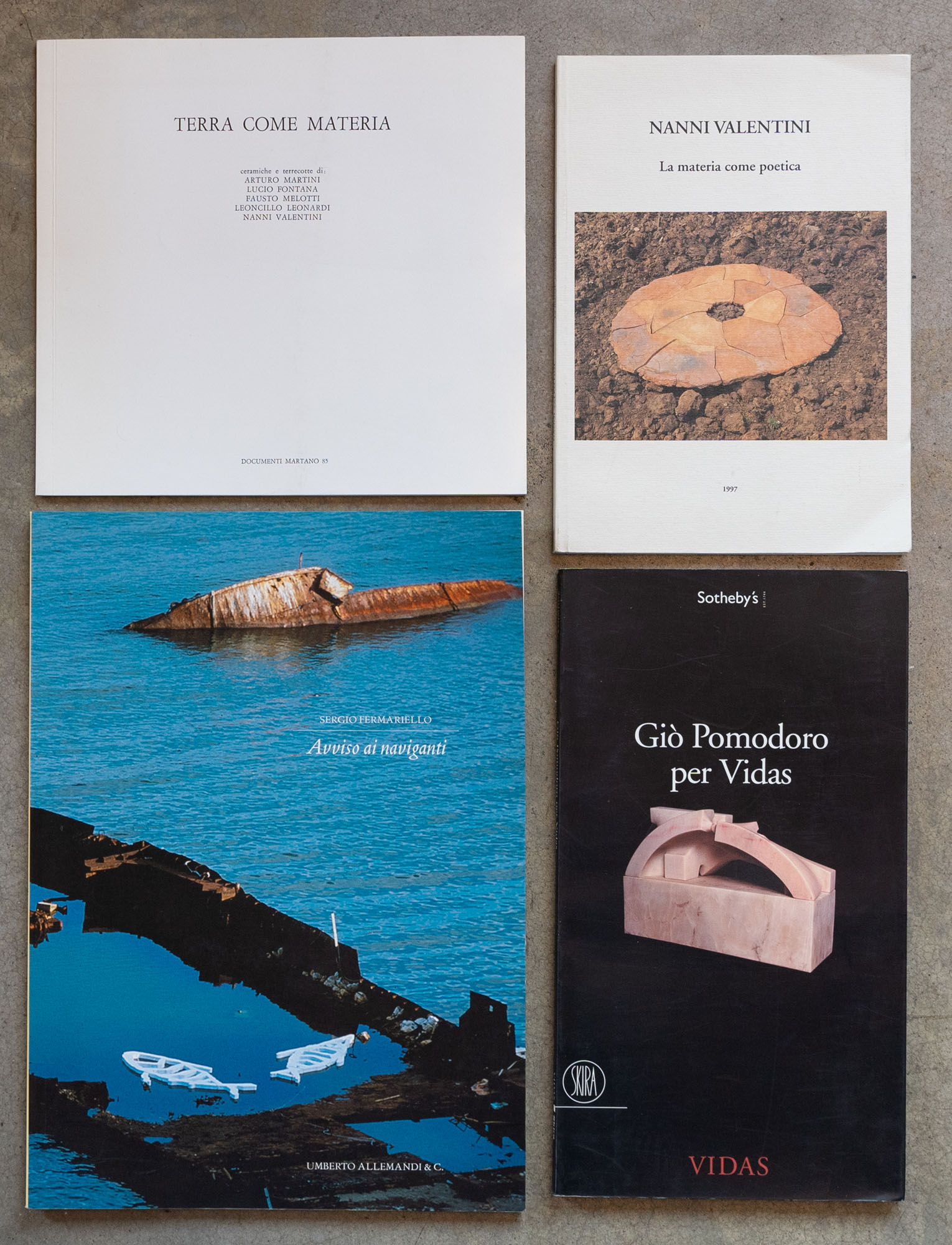 LOTTO MULTIPLOLotto di quattro cataloghiSergio Fermariello - Avviso ai naviganti2004Catalogo monografico illustrato edito in occasione della mostra tenutasi presso il Pier seventeen, Sea Port Museum, New York (4 - 18 ottobre 2004)33,5 x 24 cmEdizione Umberto Allemandi & C.Pagine 68Senza difettiNanni Valentini - La materia come poetica1997Catalogo monografico illustrato edito in occasione delle mostre tenutesi presso la Galleria Martano, Torino (6 maggio - 15 luglio 1997), la Galleria Milano, Milano (8 maggio - 30 luglio 1997) e la Galleria Peccolo, Livorno (10 maggio - 30 giugno 1997)24 x 17 cmEdizione delle gallerieSenza numero di pagineDifettiTerra come Materia1986Catalogo illustrato 22 x 23,5 cmEdizione Martano/Torino Senza numero di pagineSenza difettiSotheby's - Giò Pomodoro per Vidas2005Catalogo monografico illustrato edito in occasione dell'asta tenutasi presso Palazzo Boggi, Milano (3 maggio 2005)30 x 16,5 cmEdizione SkiraPagine 96Senza difetti