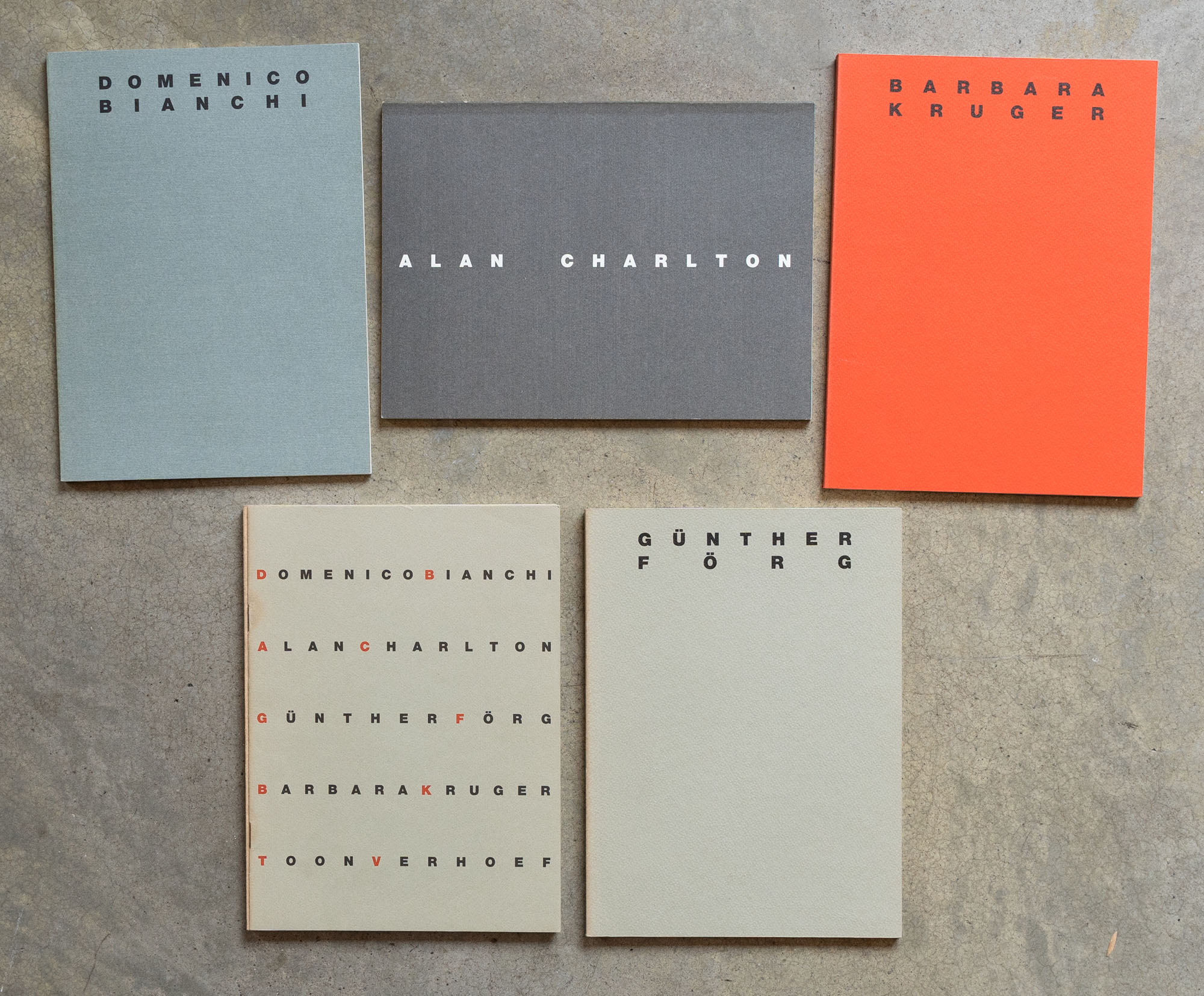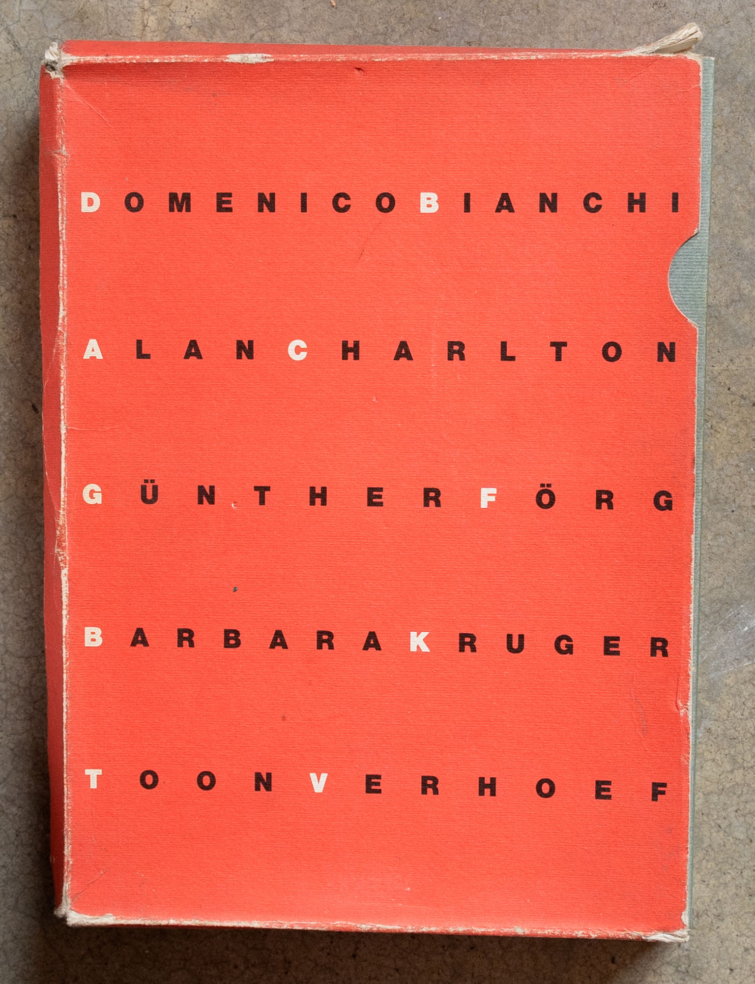 AUTORI VARIDomenico Bianchi, Alan Charlton, Gunter Forg, Barbara Kruger, Toon Verhoeff1989Cataloghi monografici illustrati entro cofanetto editi in occasione della mostra tenutasi presso il Castello di Rivoli, Museo d'Arte Contemporanea, Rivoli (6 ottobre - 3 dicembre 1989)Dimensioni di ciascun catalogo: 22,5 x 16,5 cmDimensioni complessive: 23 x 17 x 4 cmEdizione del museoDifetti