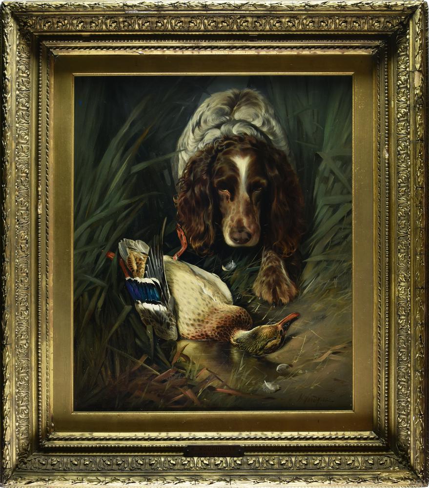 William Woodhouse CANE DA CACCIA CON ANATRA olio su tela, cm 61x51 firma