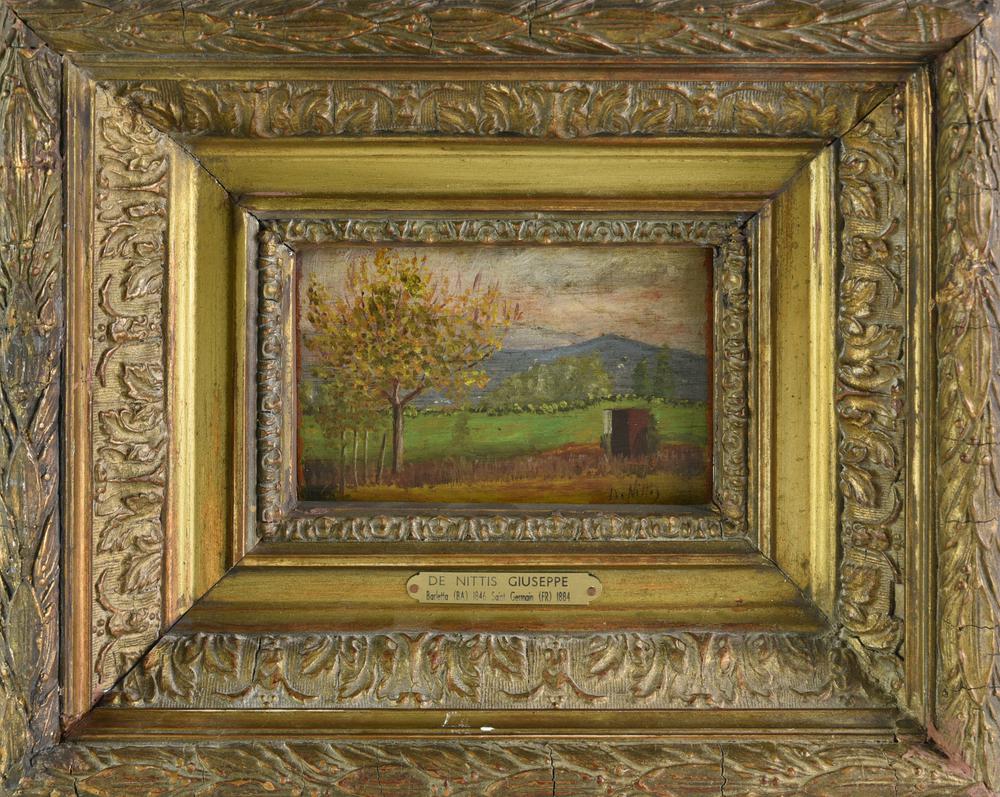 Giuseppe De Nittis PAESAGGIO olio su tavola, cm 8,4x13 circa firma sul retro:...