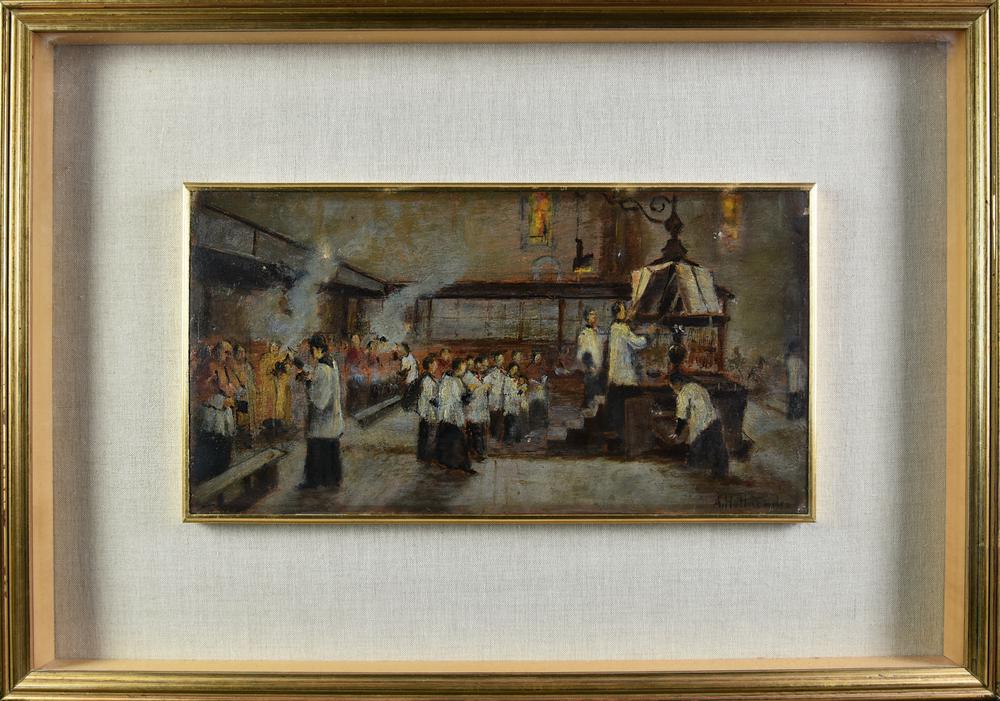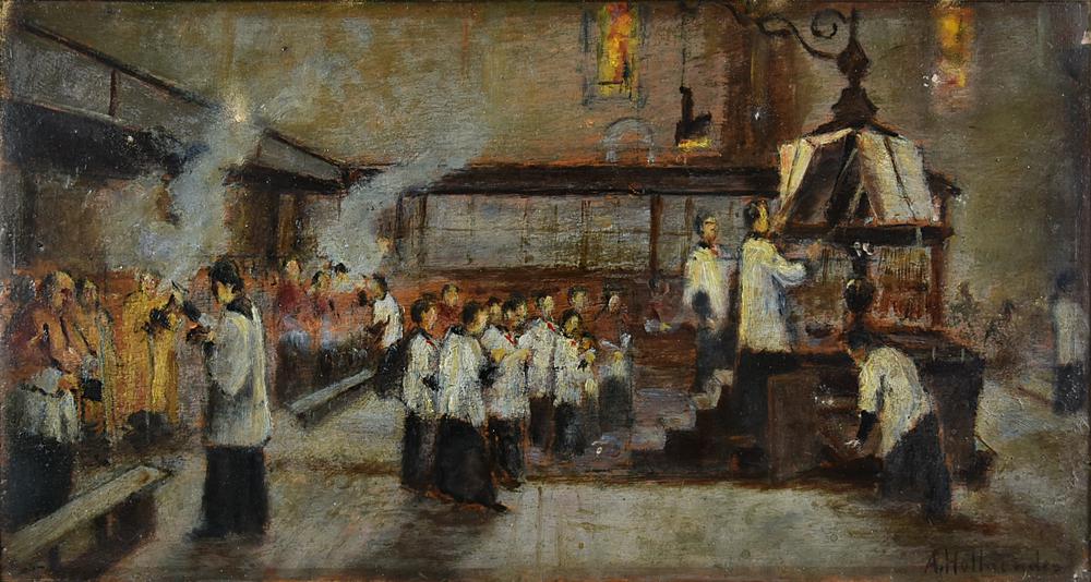 Alphons Hollaender CELEBRAZIONE RELIGIOSA olio su tavola, cm 17x33 firma