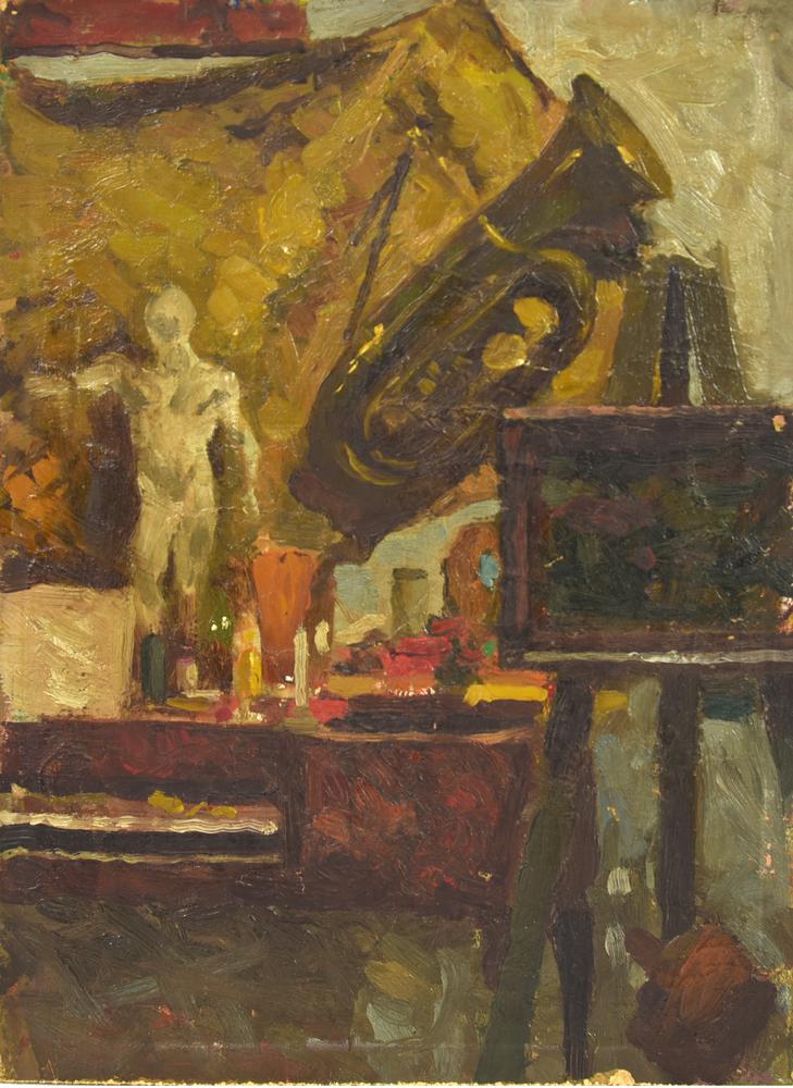 Giovanni Borgonovo L'ATELIER olio su cartone, cm 31x22,5 sul retro: firma...