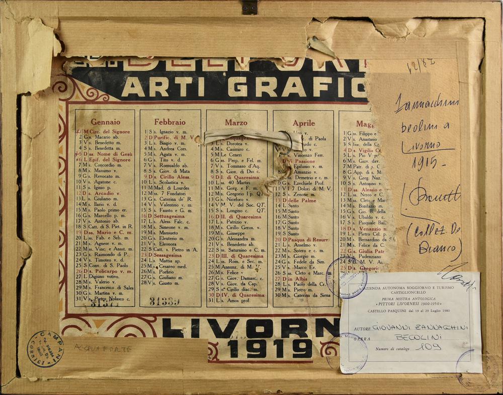sul retro: etichetta e timbri Prima mostra antologica Pittori Livornesi 1900-1950