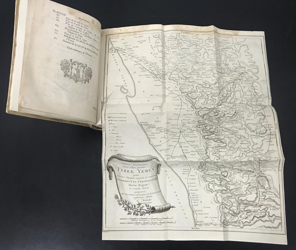 In 4. Pagine VIII, [6], 404. Bella legatura in piena pergamena coeva rimontata. Nervi, fregi e titolo in oro al dorso. 1 carta ripiegata piu' volte raffigurante lo Yemen e 67 [di 72] splendide tavole su rame tutte fuori testo.