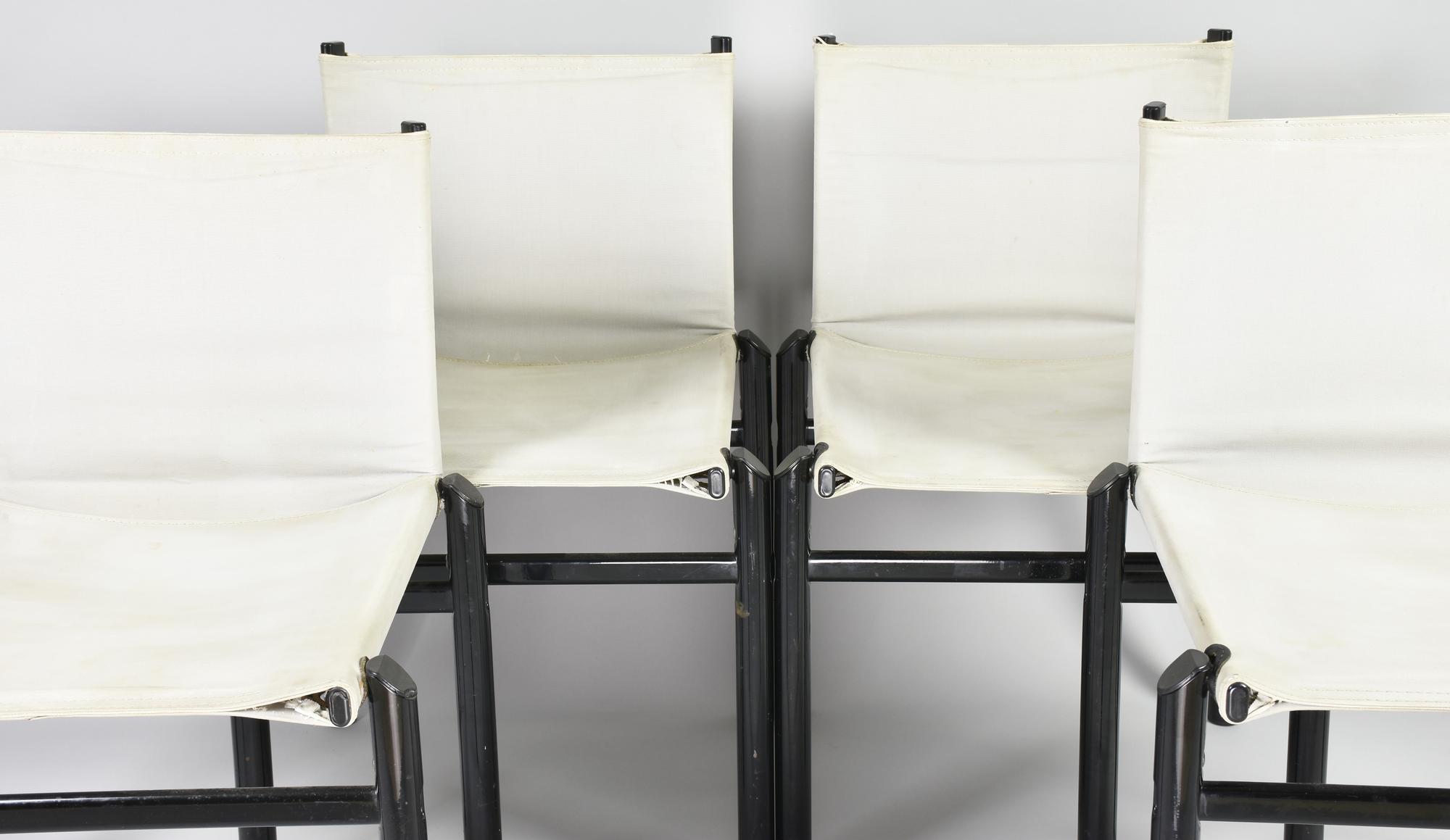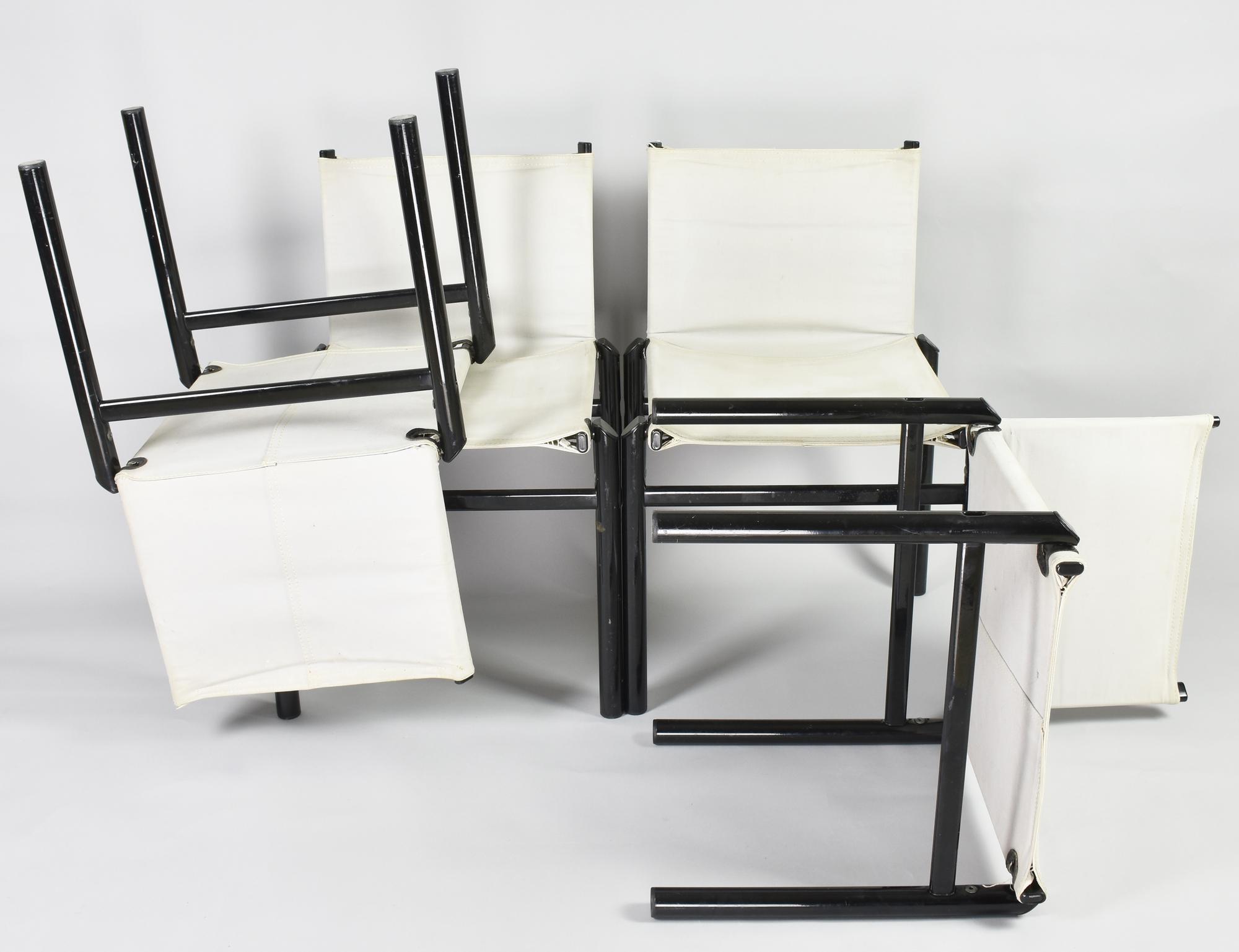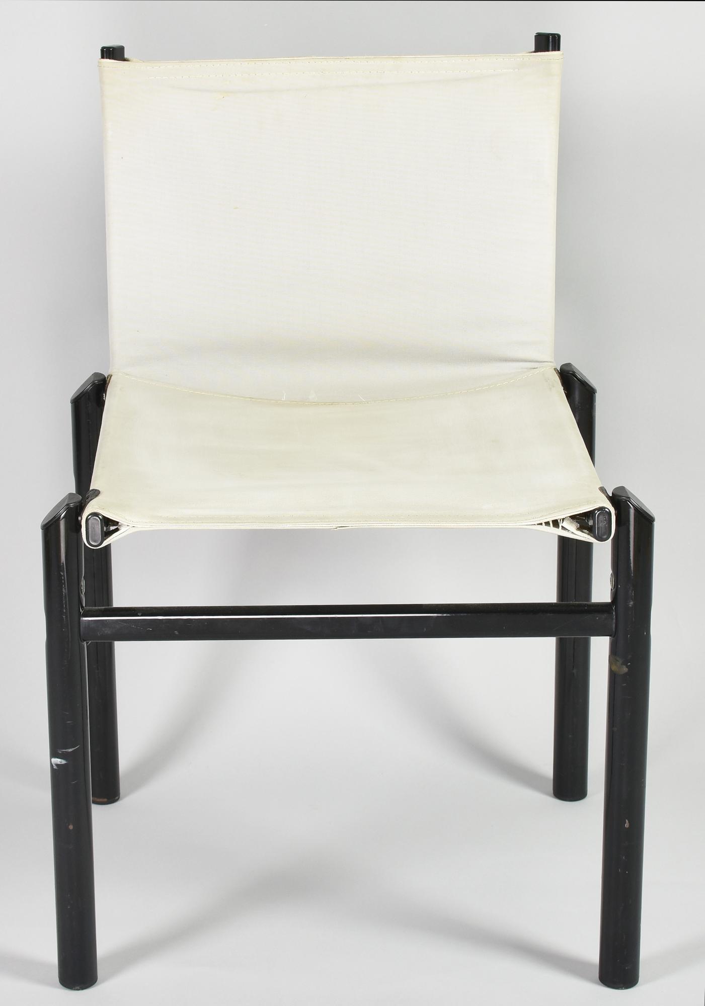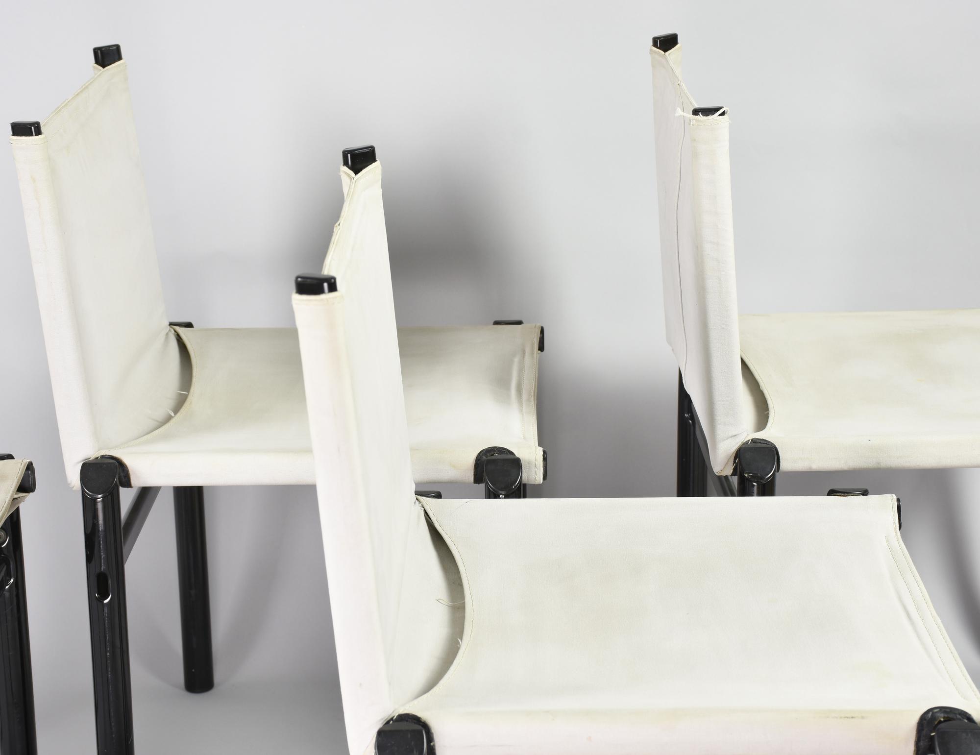 quattro sedie con struttura in metallo e seduta in tela colorata bianca