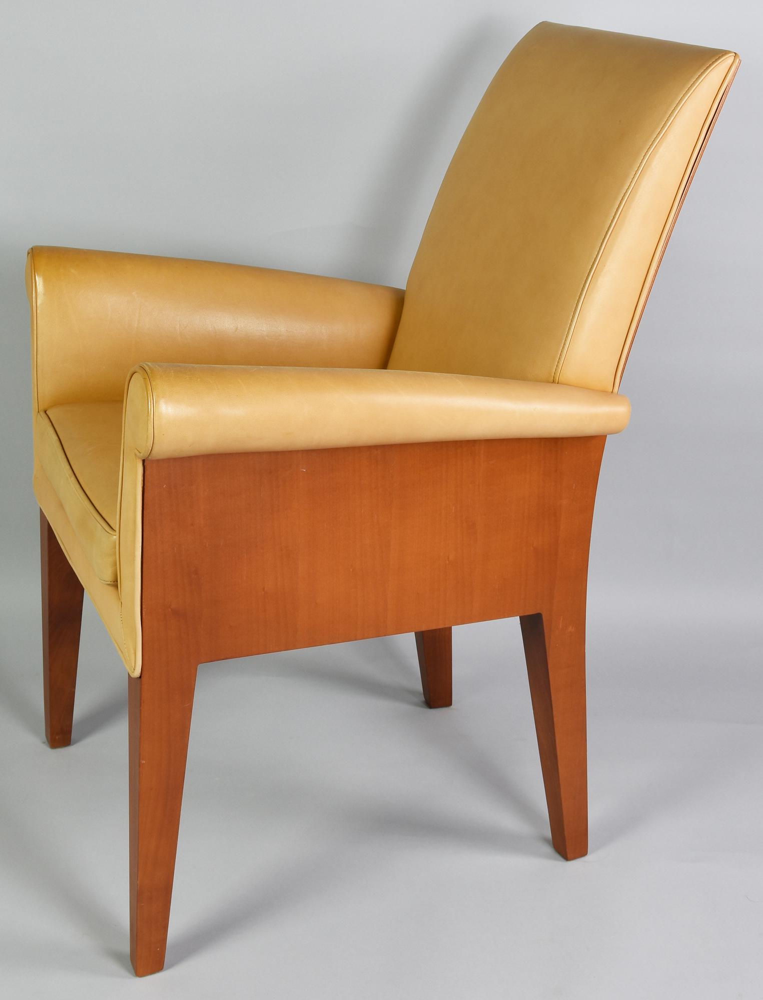 poltrona in legno con rivestimento in cuoio e seduta imbottita in poliuretano espanso