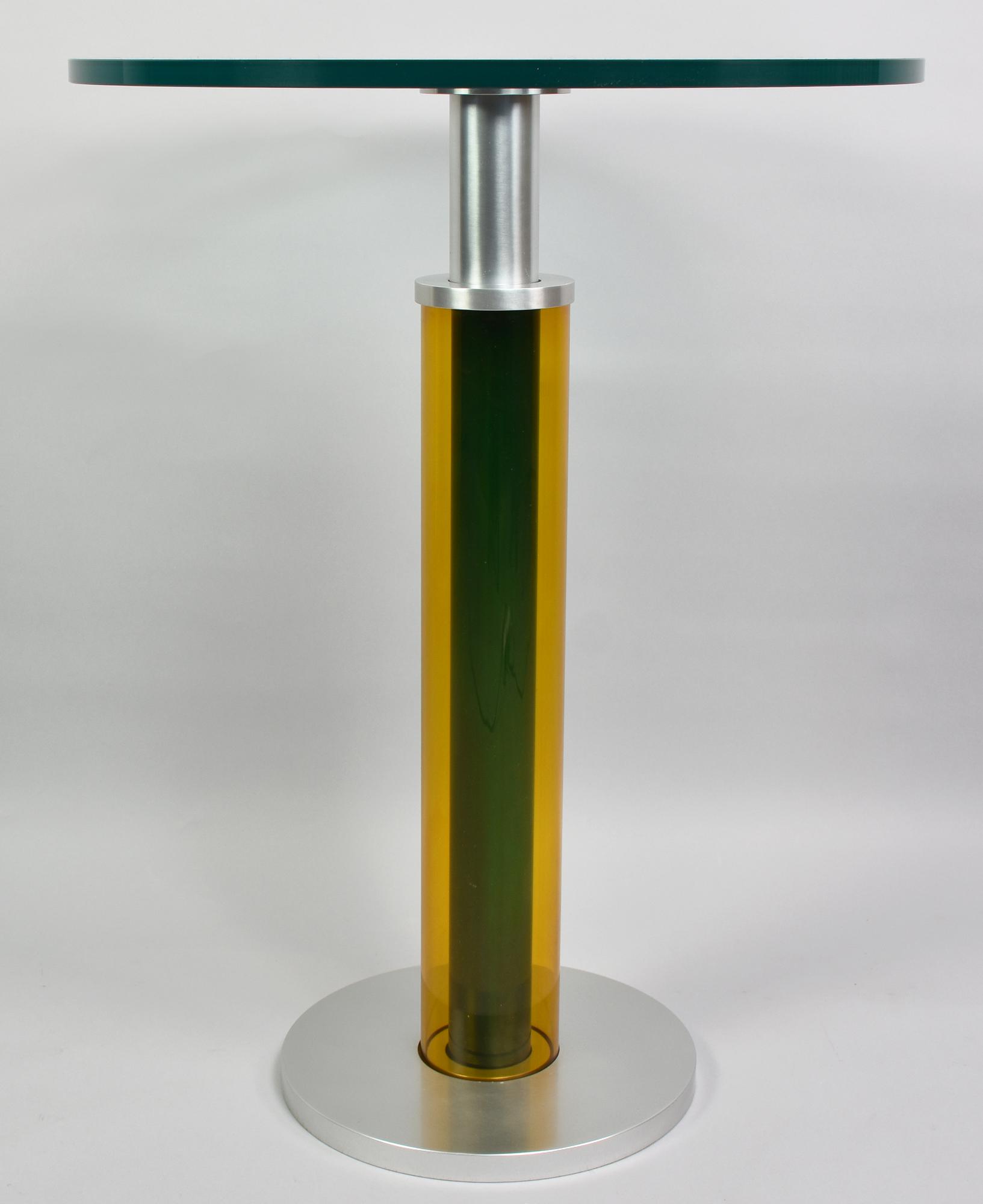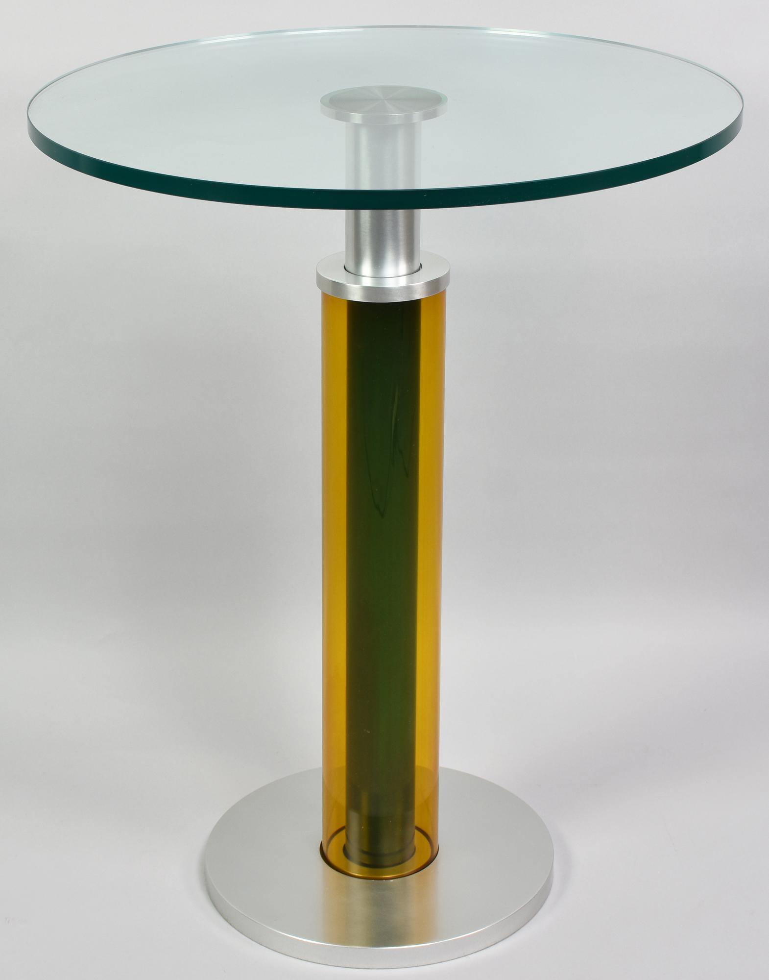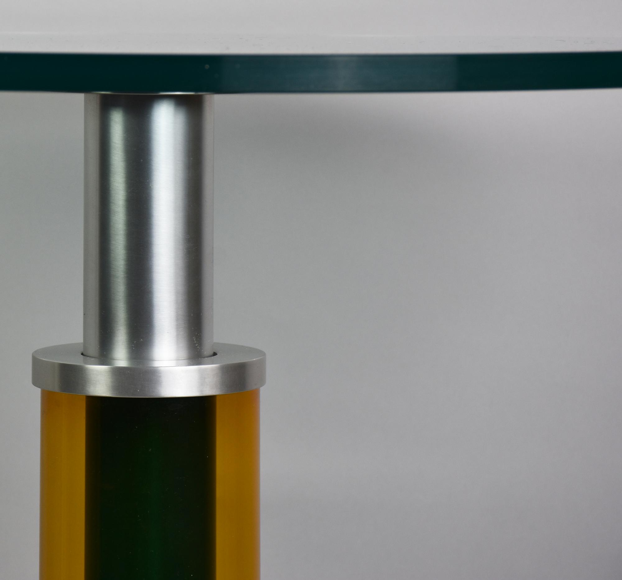 TAVOLO di gusto post-modernista con ripiano in vetro e struttura in metallo e...