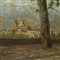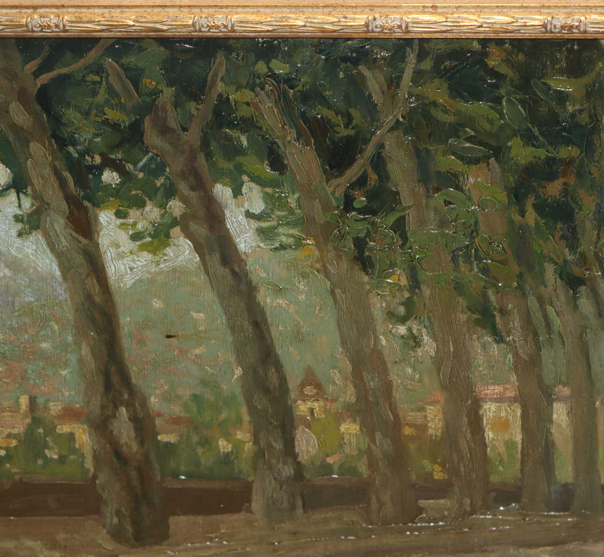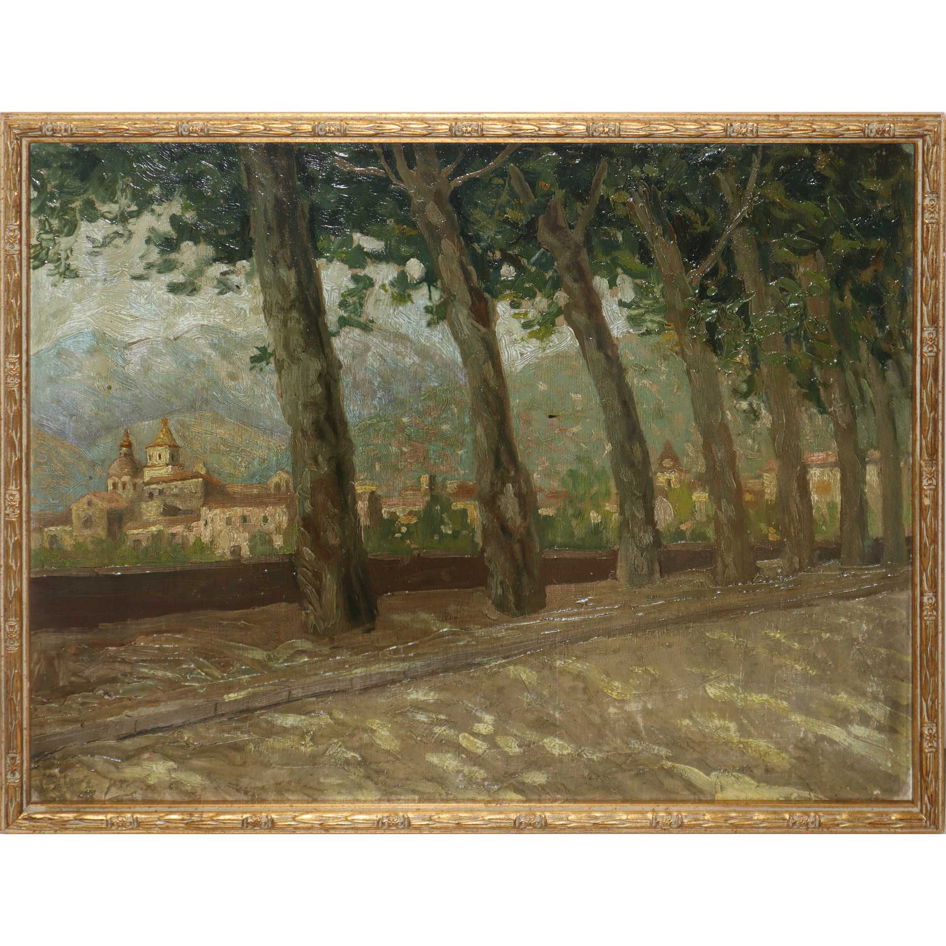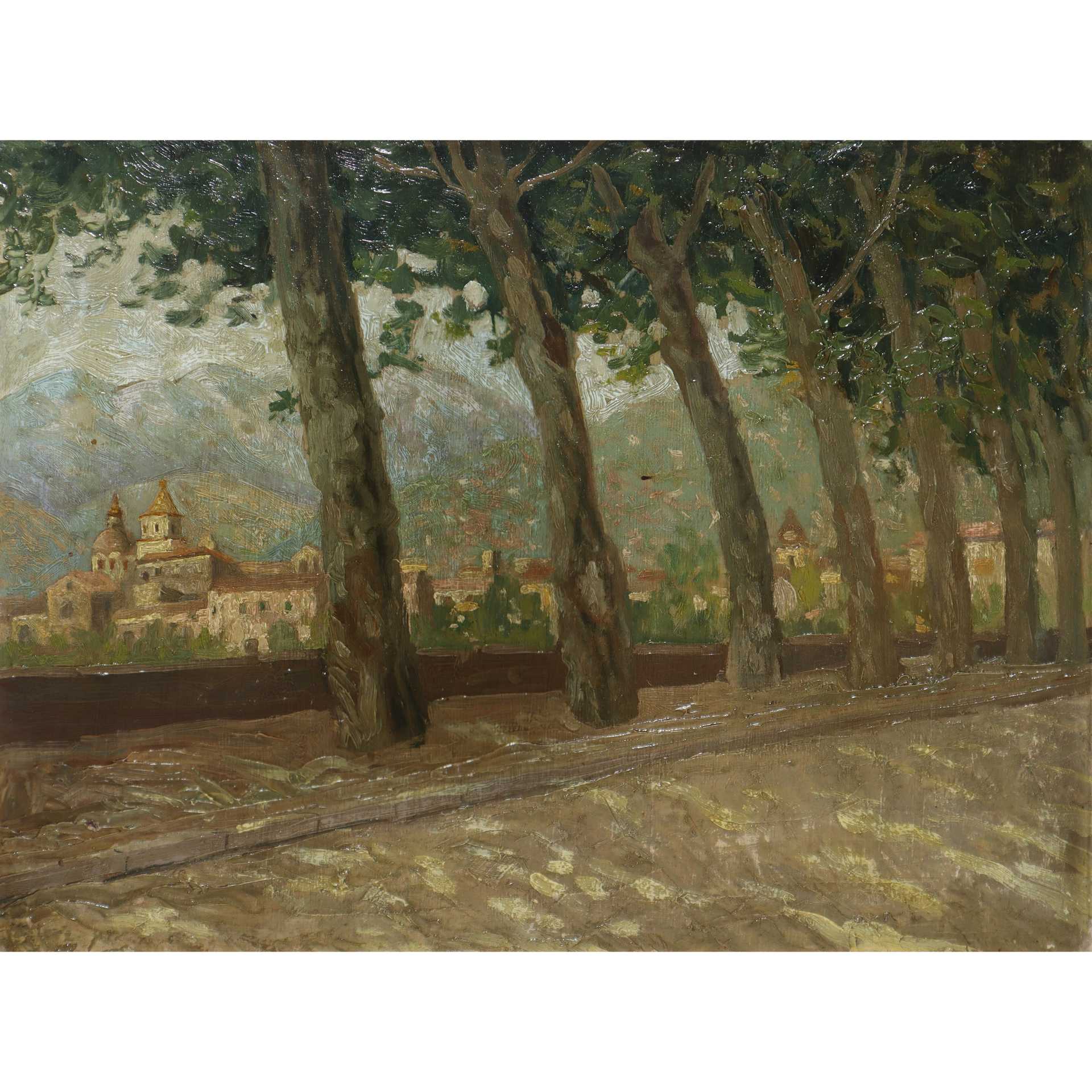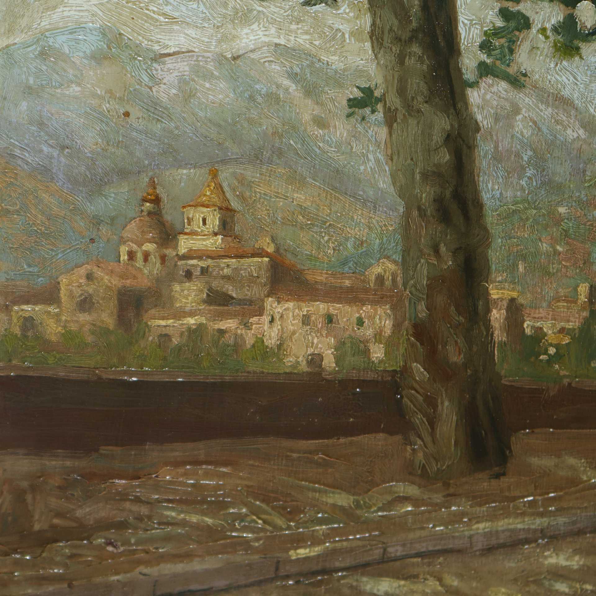 Viale alberato con chiesetta, inizi 1900s H cm 38x49 Olio su tavoletta