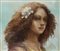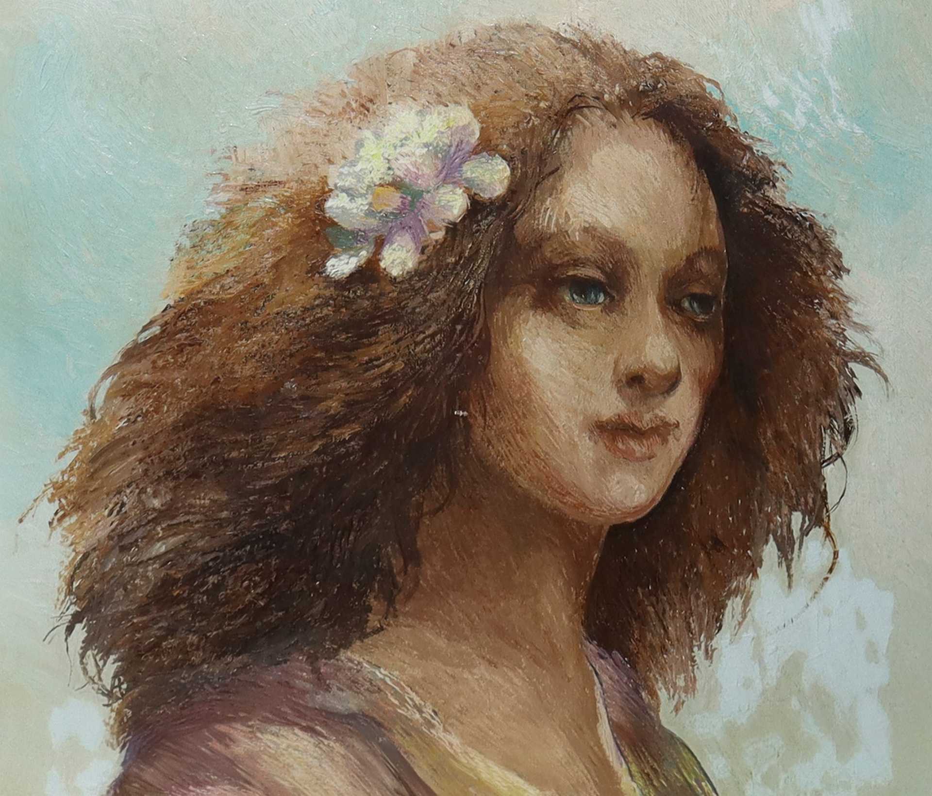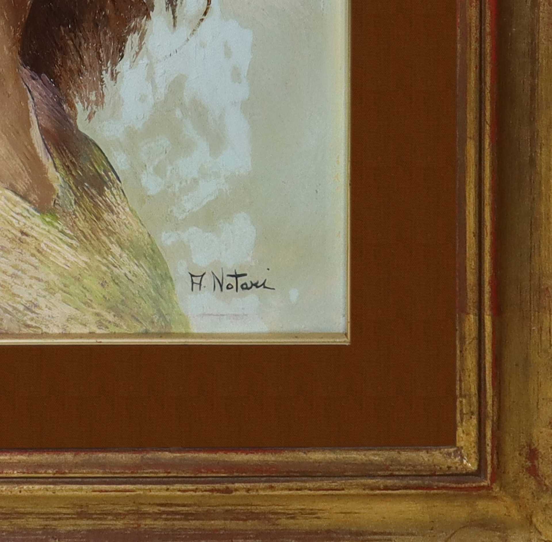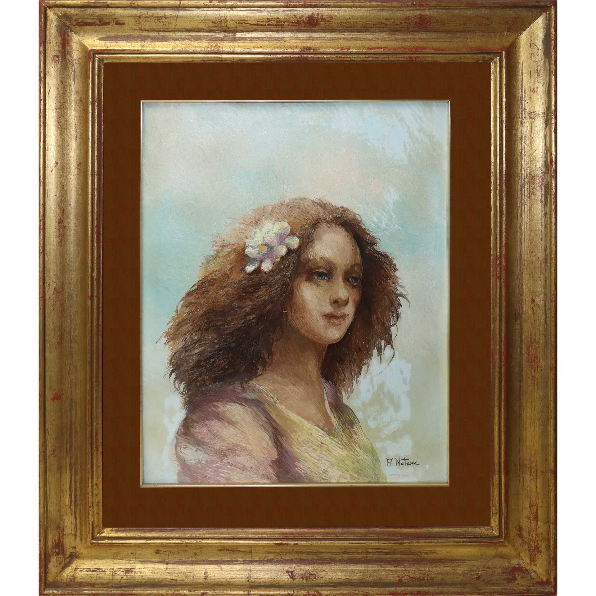 Antonio Notari (Napoli 1940) - Volto e fiore, 1981 cm 40x50 cm 74x64 Dipinto ad olio su faesite Firmato in basso a destra sul retro titolo, firma e data e Timbro Pinacoteca Piazza Spagna , Roma