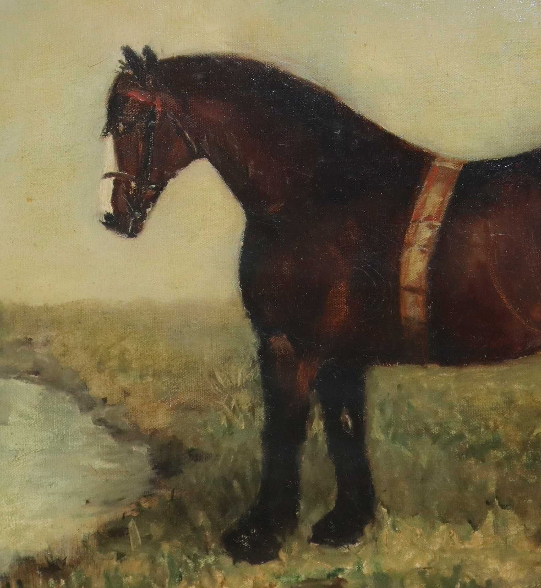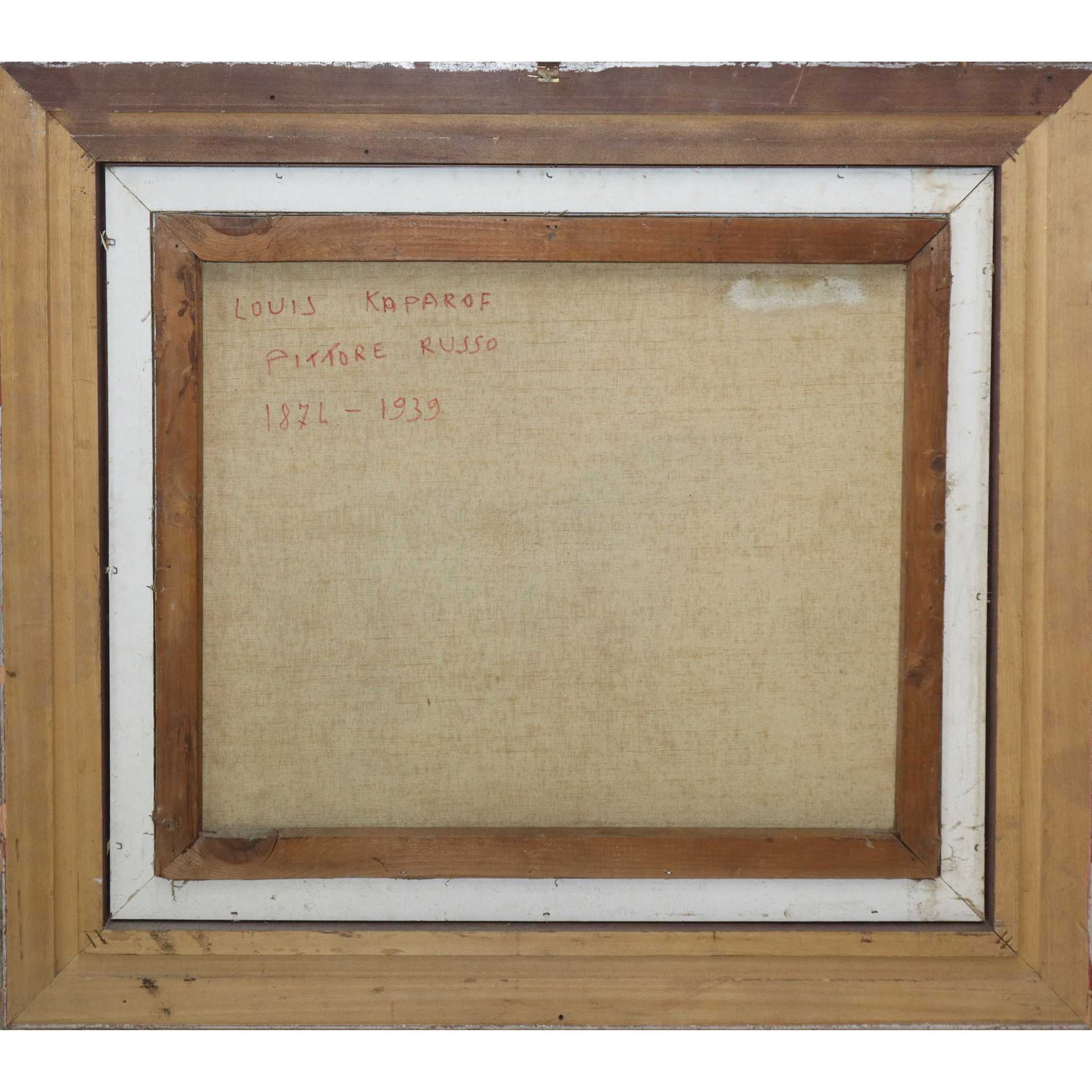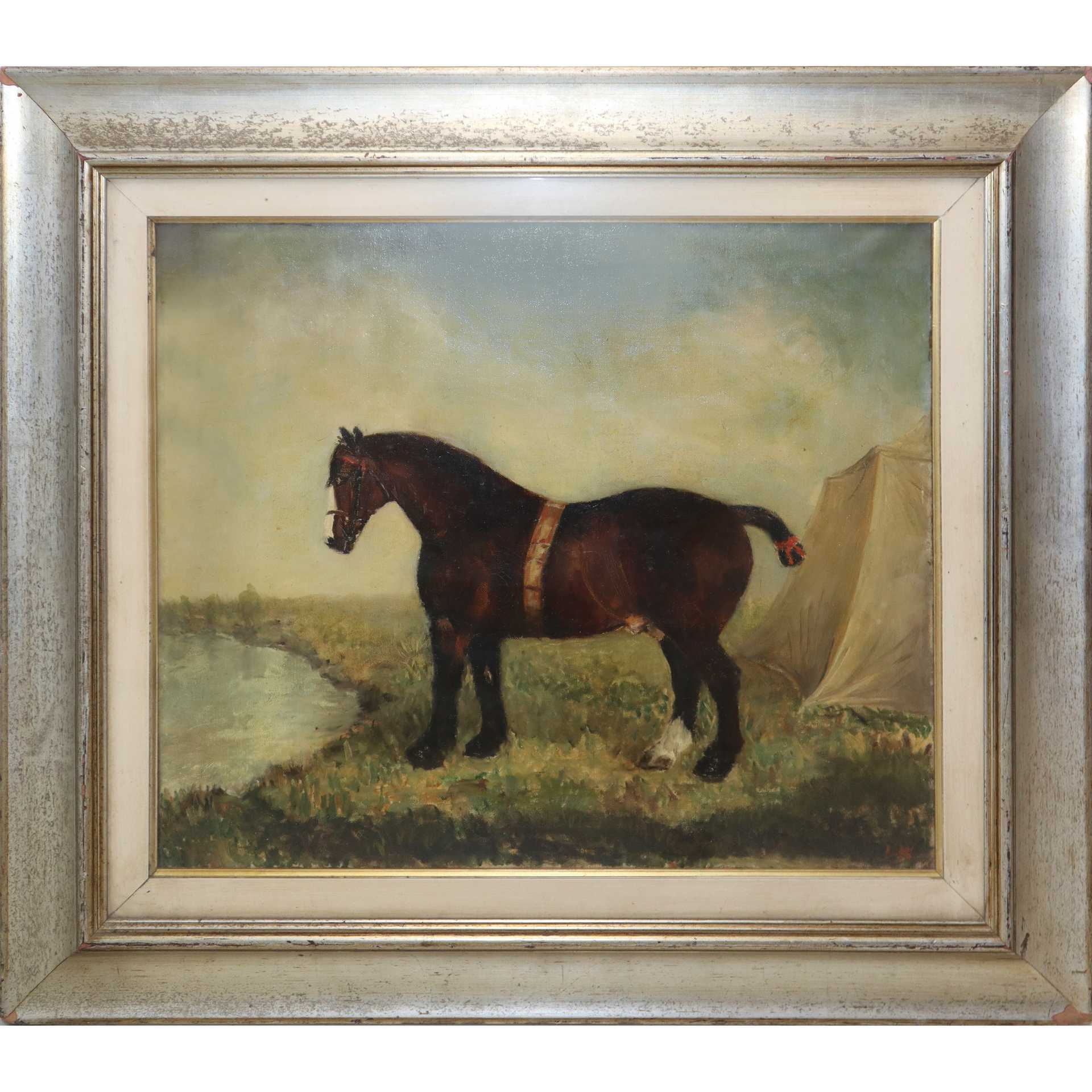 Louis Kaparof (1874-1939) - Cavallo al fiume Cm 50(h) x 60, in cornice cm 64(h) x 84 Olio su tela Firmato con monogramma LK e indicato sul retro l'autore : Louis Kaparof 1874 - 1939