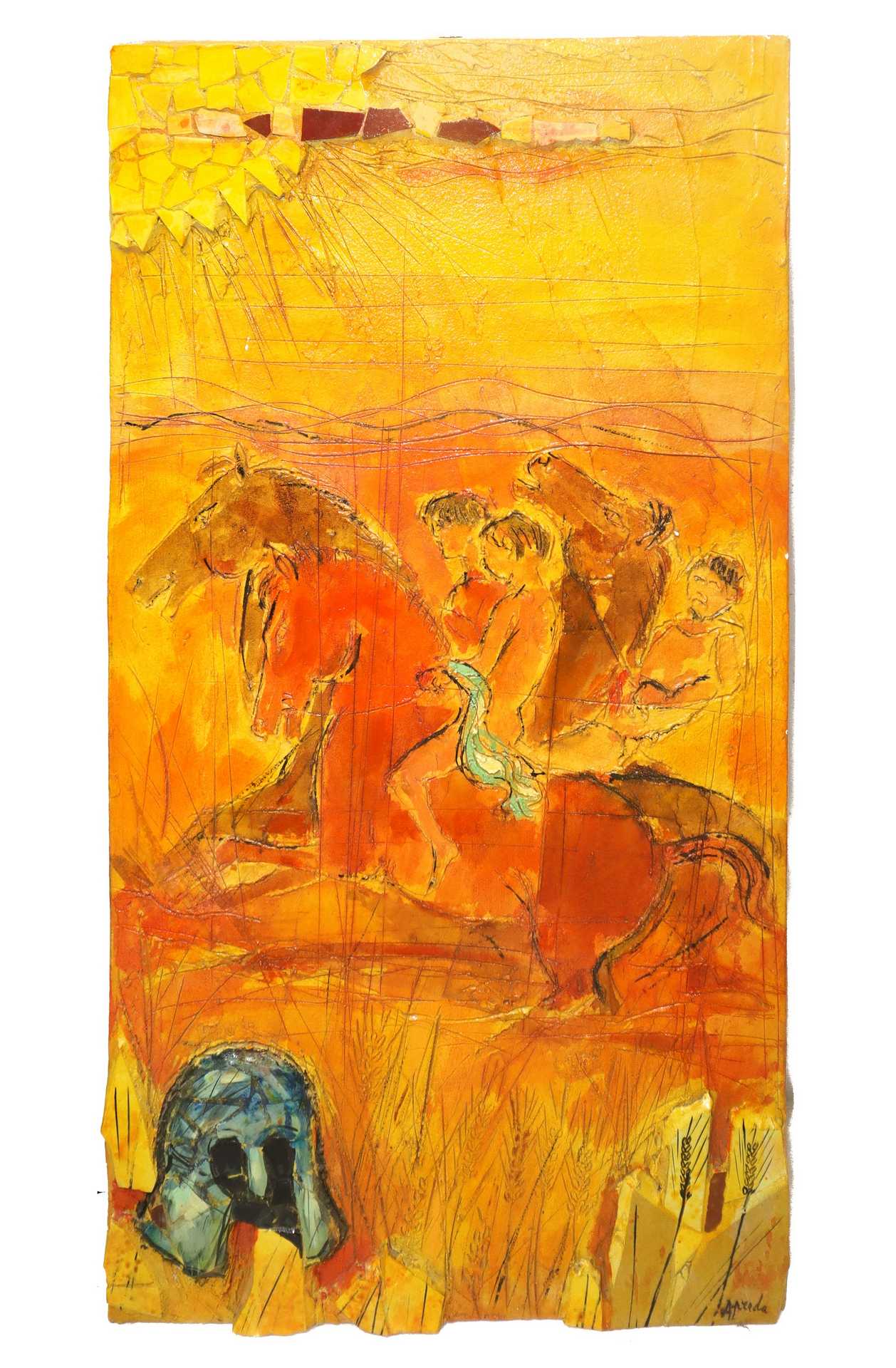 Cavalli ed elmo Cm 60x110 Tecnica mista su tavola con applicazione di ceramiche