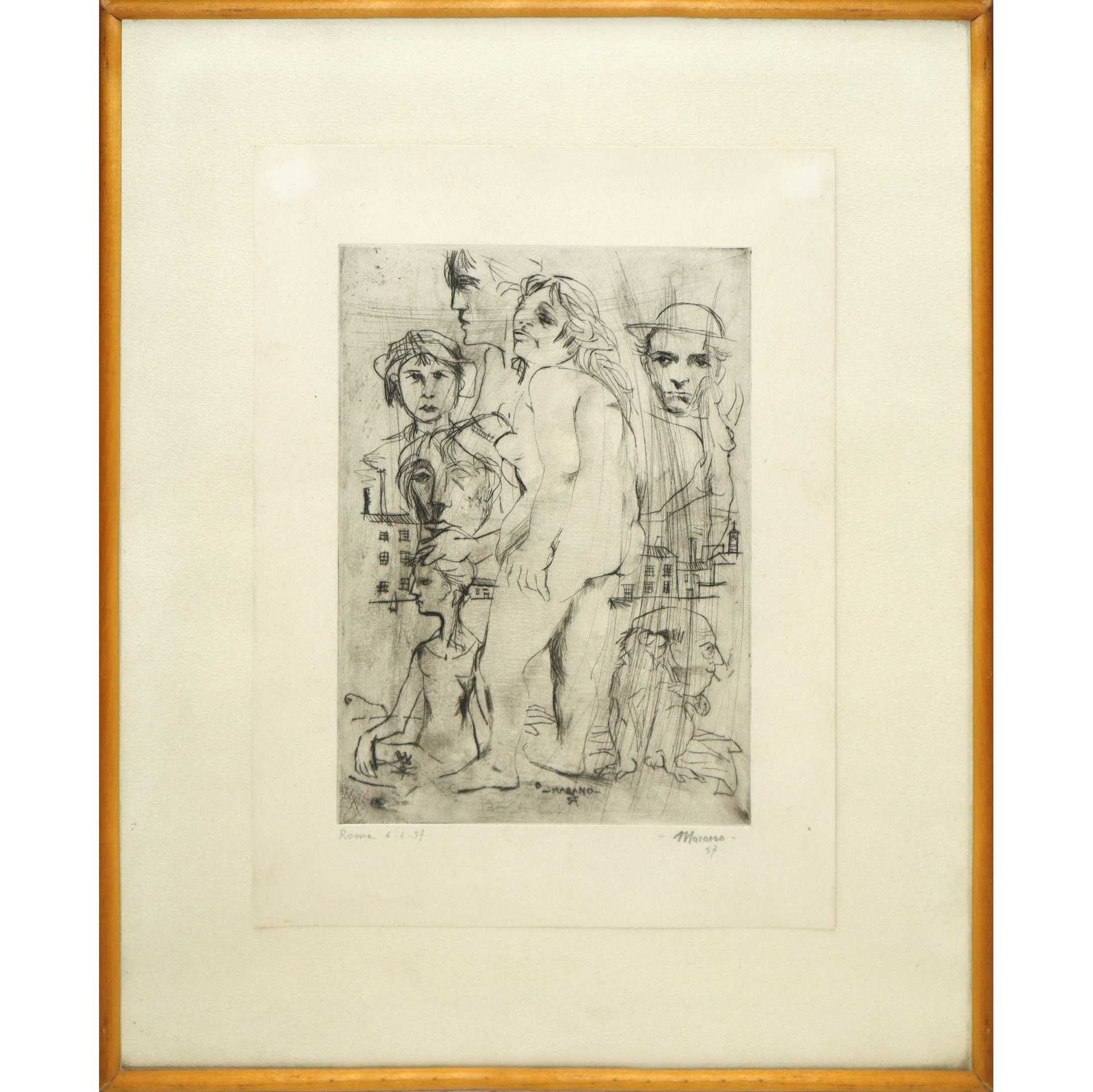 Vincenzo Marano (Acicastello 1938-2016) - Gruppo di personaggi, 1957 H cm 33,5x24 - in cornice H cm 47x37 Disegno a matita Firmato in basso a destra e datato sulla sinistra Roma 6/6/1957